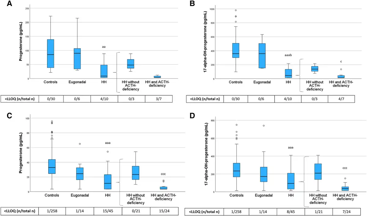 We also showed that levels of progesterone and its downstream metabolite 17α-hydroxyprogesterone were reduced in HH women but not in eugonadal women with hypopituitarism (Fig. 5). Further, both hormones were lowest in HH women with ACTH deficiency.