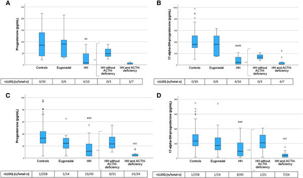 Progesterone and 17-alpha-OH-progesterone levels in PRE-Y (A, B) and POST-O (C, D) women with hypopituitarism and controls. All women were without ERT. Box boundaries represent the 25th to 75th percentile, horizontal bars represent median values, whiskers represent lowest/highest values that is not an outlier, and circles represent statistical outliers. aaaP < .001, aaP < .01 vs controls, bP < .05 vs eugonadal, cP < .05 cccP < .001 vs HH without ACTH deficiency. (Kruskal–Wallis test, with multiple pairwise comparisons by Dunn–Bonferroni test, was used to compare controls, eugonadal, and HH. Mann–Whitney U-test was used to compare HH with and without ACTH deficiency.) Values < LLOQ were set to LLOQ/√2 in the analysis.