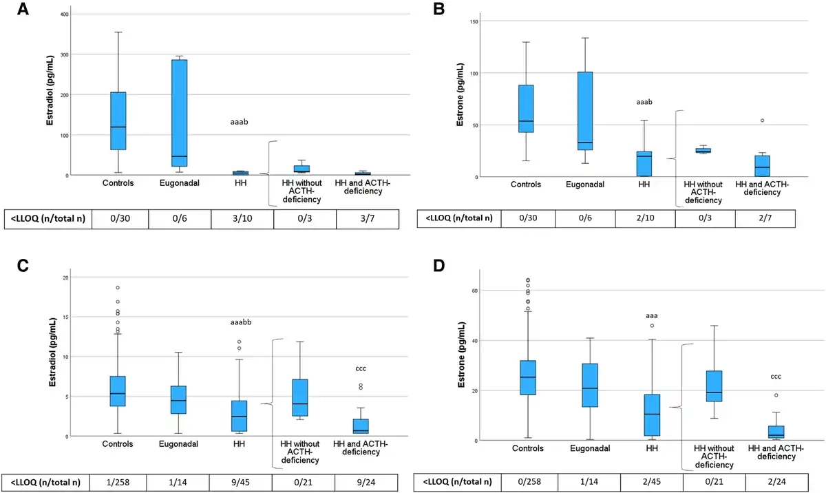 Estradiol and estrone levels in PRE-Y (A, B) and POST-O (C, D) women with hypopituitarism and controls. All women were without ERT. Box boundaries represent the 25th to 75th percentile, horizontal bars represent median values, whiskers represent lowest/highest values that is not an outlier, and circles represent statistical outliers. aaaP < .001 vs controls. bP < .05, bbP < .01 vs eugonadal. cccP < .001 vs HH without ACTH deficiency. (Kruskal–Wallis test, with multiple pairwise comparisons by Dunn–Bonferroni test, was used to compare controls, eugonadal, and HH. Mann–Whitney U-test was used to compare HH with and without ACTH deficiency.) Values < LLOQ were set to LLOQ/√2 in the analysis.