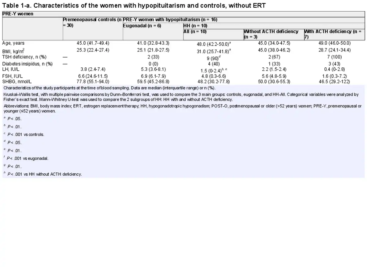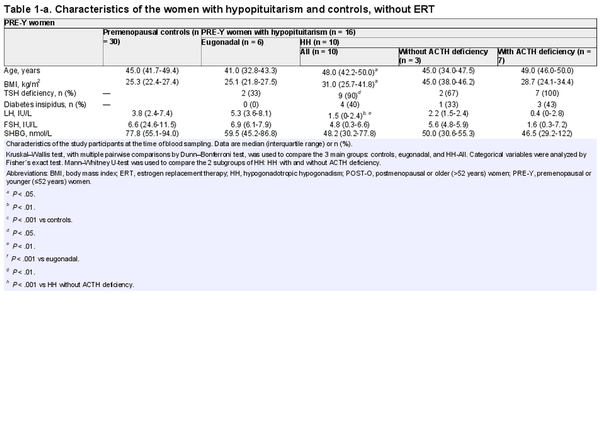 The characteristics of the study participants who were not taking ERT at the time of the blood sampling, and divided into PRE-Y and POST-O groups, are shown in Table 1. The median age of PRE-Y and POST-O women was comparable between the controls and women with HH but lower in the eugonadal women with hypopituitarism. Body mass index was higher in the HH women compared to controls. As expected, gonadotropin levels differed across the groups and were lowest in HH women, particularly in those with ACTH deficiency.