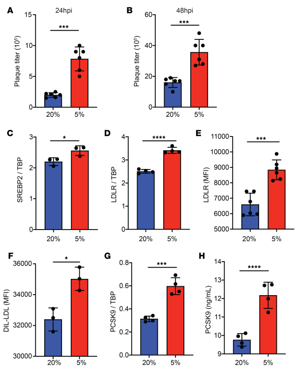 (A and B) Plaque titers from normoxic (blue) and hypoxic (red) Huh7 cells 24 (A) and 48 (B) hours after DENV2 infection. Data are expressed as PFU per milliliter of culture supernatant. (C) SREBP2 mRNA levels in normoxic (blue) and hypoxic (red) Huh7 cells after 24 hours’ incubation. (D) LDLR mRNA levels in normoxic (blue) and hypoxic (red) Huh7 cells 24 hours after oxygen adaptation. (E) MFI of LDLR in normoxic (blue) and hypoxic (red) Huh7 cells 24 hours after oxygen adaptation as assessed by flow cytometry. (F) MFI of DIL-LDL in normoxic (blue) and hypoxic (red) Huh7 cells 24 hours after oxygen adaptation as assessed by flow cytometry. (G) PCSK9 mRNA expression in normoxic (blue) and hypoxic (red) Huh7 cells 24 hours after oxygen adaptation. (H) Levels of secreted PCSK9 in normoxic (blue) and hypoxic (red) Huh7 cells 24 hours after oxygen adaptation as measured by ELISA. Experiments were replicated 3 times, each with a minimum of 3 biological replicates. Representative data from 1 of these 3 independent experiments are shown. Data in A–H represent the mean ± SD. *P < 0.05, ***P < 0.001, and ****P < 0.0001, by unpaired t test.