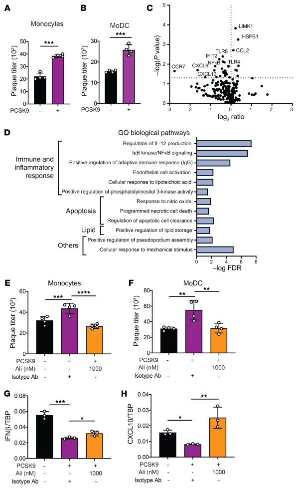(A) Plaque titers for hypoxic primary monocytes 48 hpi with DENV infection. Cells were cultured without (black) or with supplementation of 400 ng/mL PCSK9 (purple) 24 hours before DENV2 infection. (B) Plaque titers for hypoxic primary MoDCs 48 hpi with DENV infection. Cells were cultured without (black) or with supplementation of 400 ng/mL PCSK9 (purple) 24 hours before DENV2 infection. (C) Volcano plot displaying 245 genes detected by NanoString in primary monocytes 24 hpi with DENV2. (D) Pathway analysis of genes that were most abundantly downregulated in PCSK9-supplemented primary monocytes as compared with nonsupplemented cells 24 hpi with DENV2 infection. Downregulated genes were analyzed against the GO biological pathway analysis and further summarized via REVIGO web server. (E) Plaque titers of hypoxic primary monocytes 48 hours after DENV2 infection. Cells were cultured without PCSK9 (black), with supplementation of 400 ng/mL PCSK9 (purple), or with PCSK9 and alirocumab (orange). (F) Plaque titers of hypoxic primary MoDCs 48 hours after DENV infection. Cells were cultured without PCSK9 (black), with supplementation of 400 ng/mL PCSK9 (purple), or with PCSK9 and alirocumab (orange). (G and H) mRNA expression of IFNB (D) and CXCL10 (E) in hypoxic MoDCs without (black) or with PCSK9 supplementation (purple) 6 hours after DENV2 infection. Experiments in A, B, E, and H were replicated 3 times, each with a minimum of 3 biological replicates. Representative data from 1 of these 3 independent experiments are shown. *P < 0.05, **P < 0.01, ***P < 0.001, and ****P < 0.0001, by unpaired t test (A and B) and 1-way ANOVA corrected for multiple comparisons (E–H). Data in A, B, and E–H represent the mean ± SD.