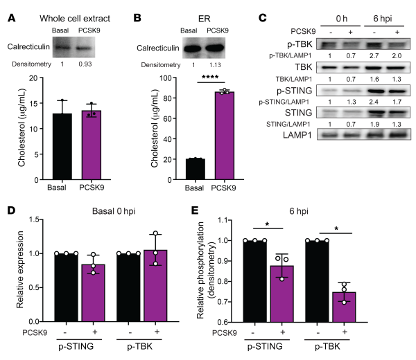 (A) ER cholesterol quantification of whole-cell extract of Huh7 cells with (purple) and without (black) PCSK9 supplementation. (B) ER cholesterol quantification of ER organelles from Huh7 cells with (purple) and without (black) PCSK9 supplementation. (C) Representative Western blot of levels of p-TBK, TBK, p-STING, STING and LAMP1 with or without PCSK9 supplementation in Huh7 cells, 0 and 6 hours after DENV2 infection. LAMP1 served as a loading control. Numbers under each Western blot indicate the levels of each protein normalized to LAMP1 and relative to Huh7 cells without PCSK9 supplementation at 0 hpi. (See the complete unedited blots in the supplemental material.) (D and E) DENV infection samples in Figure 3C were analyzed 3 times as shown by densitometry. Relative phosphorylation represents the levels of each protein normalized to LAMP1 and relative to Huh7 cells without PCSK9 supplementation, 0 (D) and 6 (E) hours after DENV2 infection. Experiments were replicated 3 times, each with a minimum of 3 biological replicates. Representative data from 1 of these 3 independent experiments are shown. Data in A, B, D, and E represent the mean ± SD. *P < 0.05 and ****P < 0.0001, by unpaired t test.