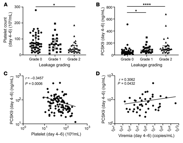 To verify that our in vitro findings were clinically pertinent, we examined the association between plasma PCSK9 levels, DENV viremia, and disease severity in a nested case-control study using a previously described prospectively enrolled cohort of patients with dengue (). A total of 314 patients with suspected dengue were enrolled at 2 Vietnamese hospitals, either as outpatients with less than 72 hours of fever, or after hospitalization. Of these, 263 patients were laboratory-confirmed dengue cases (ref. and Table 1). A subset of 111 individuals with good clinical and basic laboratory data (serial measurements of platelet, WBC, neutrophil and lymphocyte counts in whole blood, serum aspartate aminotransferase [AST] and alanine transaminase [ALT] levels, as well as plasma viremia, as measured by quantitative reverse transcription PCR [qRT-PCR] at enrollment) and availability of residual plasma for PCSK9 measurements were included in this analysis. PCSK9 levels in each patient were measured at 3 time points (1–3 days after illness onset, 4–6 days after illness onset and at convalescence, and 10–14 days after illness onset) (Table 2). Patients were classified into 3 predefined categories of increasing disease severity in terms of plasma leakage: grade 0, no evidence of leakage; grade 1, an increase of 15%–20% in hematocrit (HCT) and/or fluid accumulation and; grade 2, development of severe leakage including an HCT increase of more than 20%, dengue shock syndrome (DSS), or compromised respiratory function. Relevant clinical details on the 111 patients analyzed in this study are provided in Table 1. Consistent with previous findings, platelet counts were significantly lower in patients with grade 2 compared with grade 0 plasma leakage 4–6 days after illness onset, which is around the period of defervescence when signs of severe dengue commonly manifest (Figure 5A).