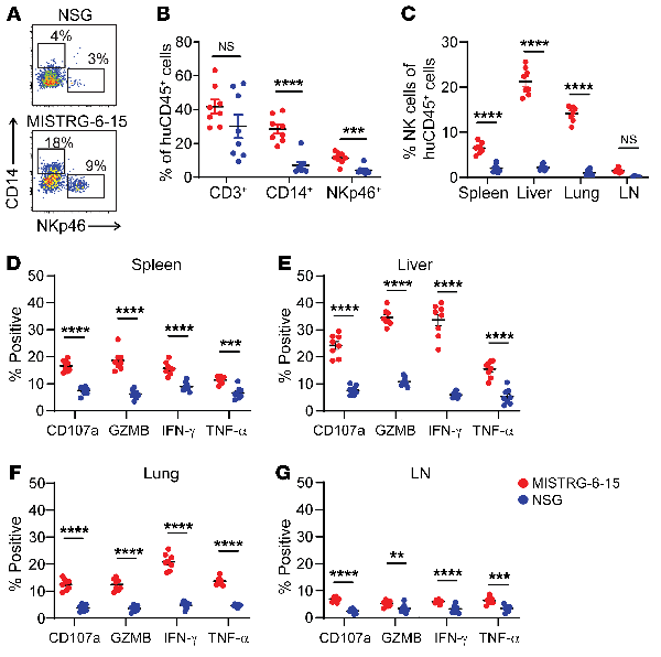 (A) Representative flow cytometry plots of NKp46+ and CD14+ cells in blood between MISTRG-6-15 and NSG mice. (B) Percentage of CD3+, CD14+, and NKp46+ cells in blood. Cells were gated on human CD45+ population. (C) Percentage of CD3–CD56+ NK cells (defined by CD56 and not NKp46, to reduce inclusion of group 1 and 3 innate lymphoid cells) in spleen, liver, lung, and LN. Cells were gated on human CD45+ population. (D–F) Percentage of CD107a+, GZMB+, IFNγ+, and TNFα+ NK cells in spleen (D), liver (E), lung (F), and LN (G) after 4 hours of ex vivo stimulation with PMA/ionomycin. Data displayed as mean ± SEM. 8 mice per group. P values were calculated using 2-way ANOVA with Šidák’s multiple comparison test. **P < 0.01, ***P < 0.001, and ****P < 0.0001.