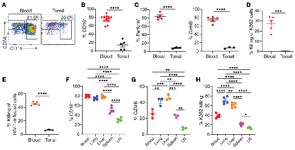 (A–E) NK cells from human blood and tonsils were gated on CD3–CD56+ population. (A) Representative flow cytometry plots of CD56 and CD16 expression of human blood and tonsil NK cells. (B) Percentage of CD16+ NK cells in blood (n = 13) and tonsil (n = 5). (C) Percentage of Perforin+ or GZMB+ NK cells in blood and tonsil after 4 hours of PMA/ionomycin stimulation. (D and E) Percentage of killing of K562 (D) and HIV-1 infected CD4+ T cells (E) after coculture for 4 hours at 1:1 effector-to-target ratio (E:T). Symbols represent biologically independent samples isolated from blood (n = 5) and tonsils (n = 3) from healthy donors. (F–H) in humanized MISTRG-6-15 mice, percentage of (F) CD16+ NK cells (n = 5), (G) GZMB+ NK cells (n = 3), and (H) K562 killing (n = 5) by NK cells in the blood, lung, liver, spleen, and LN after ex vivo culture for 4 hours with K562 targets at 1:1 E:T. Data displayed as mean ± SEM. In B–E, P values were calculated using unpaired, 2-tailed t tests. In F–H, P values were calculated using 1-way ANOVA with Tukey’s multiple comparison post test. **P < 0.01, ***P < 0.001, and ****P < 0.0001.