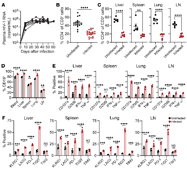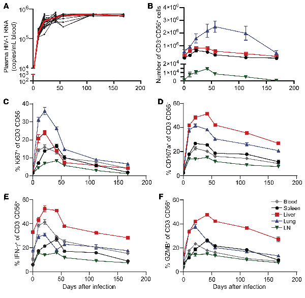 MISTRG-6-15 mice were infected with HIV-1BAL. On days 0, 10, 21, 42, 56, 112, and 168 after infection, 4–6 mice at each time point were euthanized for blood and tissue collection. (A) Plasma HIV-1 RNA levels; red line illustrates the average. (B) Number of human NK cells (huCD45+CD3–CD56+) throughout the course of infection in spleen, liver, lung, and LN. (C–F) Ki67, CD107a, IFN-γ, and GZMB expression by NK cells in blood, spleen, liver, lung, and LN. NK cells purified from tissues were stimulated with PMA/ionomycin ex vivo for 4 hours before flow cytometry analysis. Data displayed as mean ± SEM.