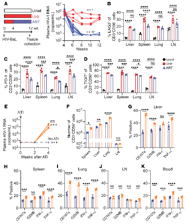 In people living with HIV-1, functional impairment of NK cells due to chronic HIV-1 infection can be partially restored by ART (–). In the MISTRG6-15 mouse model, the expansion and functional activation of NK cells occurred within the first 10 days of infection, whereas NK cell numbers and functions began to decline on day 50 and almost returned to baseline after day 100 (Figure 4). Notably, the levels of inhibitory receptors including LAG3, PD-1, and TIGIT in NK cells increased during acute infection (Figure 3F), suggesting that early ART initiation may better improve NK cell functional restoration. To test this hypothesis, we studied mice that were initially infected for 4 weeks and then compared NK cells in mice on ART for 8 weeks to those from untreated mice (Figure 5A). The levels of inhibitory receptors including LAG-3, PD-1, and TIGIT all increased on NK cells after infection and were partially reduced in mice receiving ART (Figure 5, B–D). Next, we performed analytic treatment interruption (ATI) to determine whether NK cell functions were preserved by ART. Mice under ART had undetectable viral load, and virus rebounded in all animals within 4 weeks after ATI (Figure 5E). We found that the number of NK cells in various tissues increased following ATI (Figure 5F). In addition, NK cell functions including cytokine production and cytotoxicity were also increased after ATI (Figure 5, G–K). Notably, LN NK cells responded to initial infection (Figure 3) but did not respond to viral rebound after ATI, suggesting that additional approaches might be needed for the functional restoration of LN NK cells. Nonetheless, for nonlymphoid NK cells, these results suggest that ART prevented their functional impairment — including the loss of proliferation capacity and degranulation seen in chronically infected mice (Figure 4) — and ART reinvigorated NK cells in response to HIV-1 rebound after ATI.