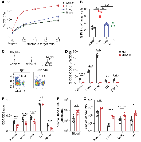 Previous studies showed that transfusion of human blood NK cells suppressed HIV infection in humanized mice (, ). While our studies here show NK cells responded to HIV-1 infection as well as viral rebound after ATI, it is unclear whether endogenous NK cells can directly impact HIV-1 replication in vivo. To address this, we first isolated NK cells from various organs of infected mice and cocultured them with HIV-infected donor-matched CD4+ T cells for 4 hours. NK cells from all of the organs did exhibit degranulation and killed HIV-1–infected target cells, but liver NK cells showed the most pronounced response (Figure 6, A and B). Next, the in vivo control of HIV-1 by NK cells was studied by depleting NK cells with a monoclonal antibody against NKp46 that has been shown to deplete human NK cells in humanized mice (). Here, depletion of NK cells was successful in all studied organs (Figure 6, C and D). On day 14 after HIV-1 infection CD4:CD8 ratios were significantly lower upon NK cell depletion compared with non-NK cell depleted mice, wit the exception of the LNs (Figure 6E). No apparent CD4 depletion was observed in LNs, even in the control mice, which is likely due to the small number of CD4+ T cells that express CCR5 (Supplemental Figure 10). Next, we collected blood and tissues to measure plasma HIV-1 RNA and cell-associated HIV-1 RNA, respectively. NK depletion led to an increase in plasma HIV-1 RNA by 5–10 fold (Figure 6F). Depletion of NK cells also caused increased cell-associated viral RNA in tissues, especially in the liver (Figure 6G), which was consistent with the robust NK cell response in the liver. These results strongly suggest that NK cells directly suppress HIV-1 replication in vivo.