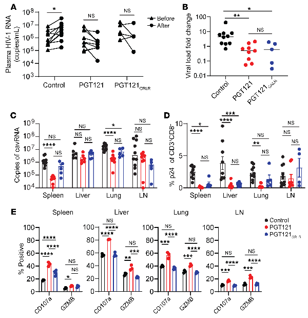 Administration of broadly neutralizing antibodies (bNab) into viremic individuals enhances viral-specific T cell responses (–) and may also modulate NK cell functions through Fc-dependent mechanisms. To address the potential role that bNab therapy may have on NK responses, we used the HIV-neutralizing antibody PGT121 () to understand the Fc-dependent NK cell functions. Although IgM+ or IgD+ human B cells develop properly in most humanized mice, a scarce amount of hypermutated, class-switched IgG antibodies are produced, mainly due to the lack of germinal center response (), necessitating a passive antibody treatment approach to study ADCC by NK cells. Moreover, we also used PGT12 with GRLR mutations that block antibody binding to Fc receptors (). PGT121 or PGT121GRLR was injected into infected mice, and viral loads in the plasma were reduced by both antibodies (Figure 7, A and B). In mice treated with PGT121, the spleen and lung had greater reduction of cavRNA and numbers of infected cells than the PGT121GRLR group (Figure 7, C and D), indicating Fc-dependent clearance of HIV-1–infected cells. No reduction was seen in the LNs, likely due to the lack of functionally mature NK cells in the LNs. Surprisingly, the number of HIV-p24+ cells in the liver was reduced by PGT121, whereas liver HIV-1 RNA was unchanged. It is possible that HIV-1 RNA signals were detected from kupffer cells that engulfed HIV-1–infected T cells upon antibody treatment. Since the GRLR mutation abolishes both ADCC (Supplemental Figure 4) and ADCP (), it is possible that macrophages and NK cells both contributed to the clearance of HIV-1–infected cells mediated by PGT121 interacting with the intact Fc fragment. Next, we aimed to evaluate the influence of antibody therapy on NK cells. NK cell functions such as degranulation and GzmB production were selectively enhanced by PGT121 in the spleen, liver, and lung, and were slightly enhanced in the lymph nodes. By contrast, the PGT121GRLR did not have any effect on NK cell functionality (Figure 7E). These results support the hypothesis that antibody therapies improve NK cell cytolytic activity in an Fc-dependent manner.