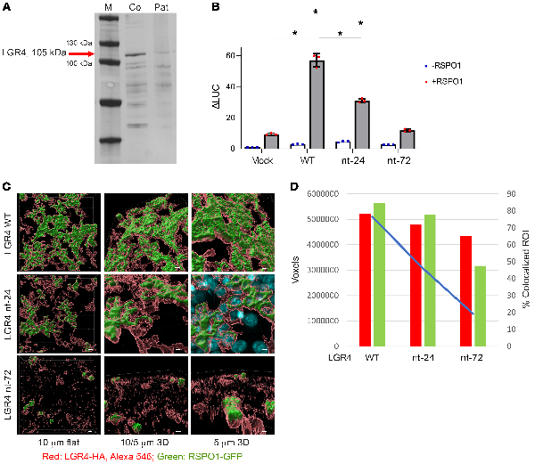 Human fibroblasts and HEK cells were used. (A) Western blot analysis for LGR4 protein expression in patient and control fibroblasts. A representative blot of 3 independent experiments is shown. β-Actin was used as a loading control. The molecular weight (kDa) of a protein standard is given. M, marker; Co, control fibroblasts; Pat, patient fibroblasts. (B) RSPO1-activated, LGR4-mediated Wnt signaling in HEK293 cells. Cells were transfected with WT and mutant LGR4 nt-24 and nt-72 plasmids (including a mock control) and reporter vectors TOP-Flash and Renilla. Signaling was stimulated by RSPO1 and assessed by the Dual-Luciferase assay (Promega). Results are expressed as relative LUC activities (RLU). Mean ± SD of 3 independent experiments is shown. *P < 0.01, Student’s t test. (C and D) Interaction of RSPO1 with membrane-localized WT and variant LGR4. HEK293 cells were transfected with HA-tagged LGR4 plasmids (pcDNA3 LGR4wt, nt-24 bp, nt-72 bp) and incubated with conditioned RSPO1-GFP SN medium (previously produced in HEK cells transfected with pSpark- RSPO1-GFP). Cells were fixed with Carnoy’s solution. Staining was performed with antibody anti–HA-Tag (green) first and antibody anti-mouse Alexa Fluor 594 (red) second. Immunofluorescent microscopy was used to detect the cellular distribution of the tagged proteins as well as their colocalization (Zeiss LSM 710). Three independent experiments were analyzed. Representative images of confocal analysis at original magnification, ×40 are shown for WT and variants of LGR4. Scale bars: 5 μm (top 2 images in middle column and right); 10 μm (left and bottom image in the middle column). Quantification of colocalized LGR4 and RSPO1 was performed by Imaris (Bitplane AG).