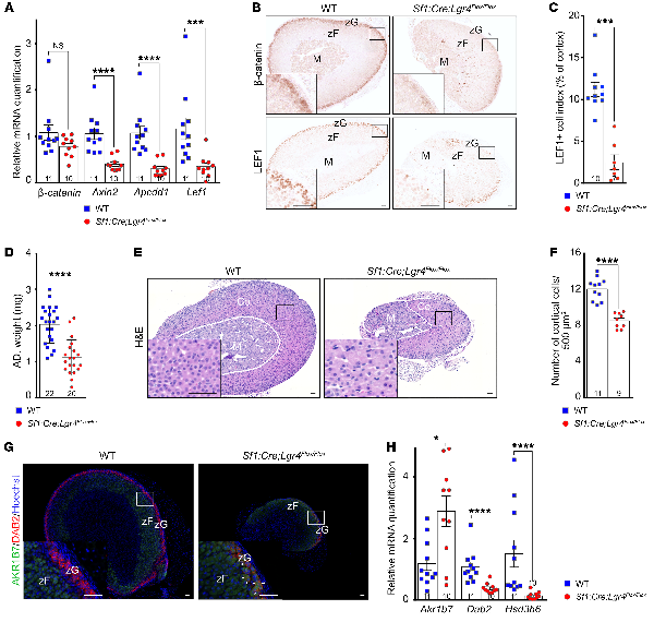 Figure 3. (A) RT-qPCR analysis of mRNA encoding Wnt/β-catenin signaling pathway–associated genes. (B) Immunohistochemical detection of β-catenin and Lef1. (C) LEF1+ cell index, defined as the percentage of LEF1+ cells over the total number of cortical cells. (D) Adrenal weight. (E) H&E staining of WT and Lgr4cKO adrenals. (F) Number of cortical cells per 500 μm2 of the cortex. (G) Coimmunostaining for Akr1b7 and Dab2 in WT and Lgr4cKO adrenals. (H) RT-qPCR analysis of mRNA encoding zone-specific markers (Akr1b7, Dab2, and Hsd3b6). All analyses were conducted in 5-week-old WT and Lgr4cKO female mice. zF, zona fasciculata; zG, zona glomerulosa; M, medulla; Co, cortex. Scale bars: 50 μm. Data are shown as the mean ± SEM. Numbers of individual samples analyzed are indicated within the bars. Statistical analyses in A, C, D, F, and H were conducted using Mann-Whitney tests in GraphPad Prism 9. *P < 0.05, ***P < 0.001, ****P < 0.0001.