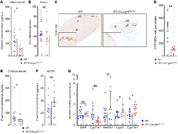 Consistent with observations in our patient, zG differentiation anomalies in Lgr4cKO mice resulted in a significant decrease in plasma aldosterone (Figure 4A) and an increase in hematocrit, suggestive of dehydration (Supplemental Figure 9C). The observation of normal plasma renin activity (Figure 4B) suggested that hypoaldosteronism in Lgr4cKO mice was of primary adrenal origin. This was further supported by the almost complete extinction of CYP11B2 protein expression in the Lgr4cKO zG (Figure 4, C and D). Interestingly, plasma corticosterone concentration was significantly decreased (Figure 4E); this was associated with a significant decrease in Cyp11a1 expression, which is essential for the first step of both aldosterone and corticosterone synthesis (Figure 4G). However, there was a concomitant increase in Cyp21 and Cyp11b1 expression, which was not associated with altered plasma ACTH concentration (Figure 4, F and G). This may reflect the aberrant expansion of zF at the expense of zG, and hence an increased ratio of zF to zG cells, rather than a direct effect of ACTH on steroidogenic gene expression.