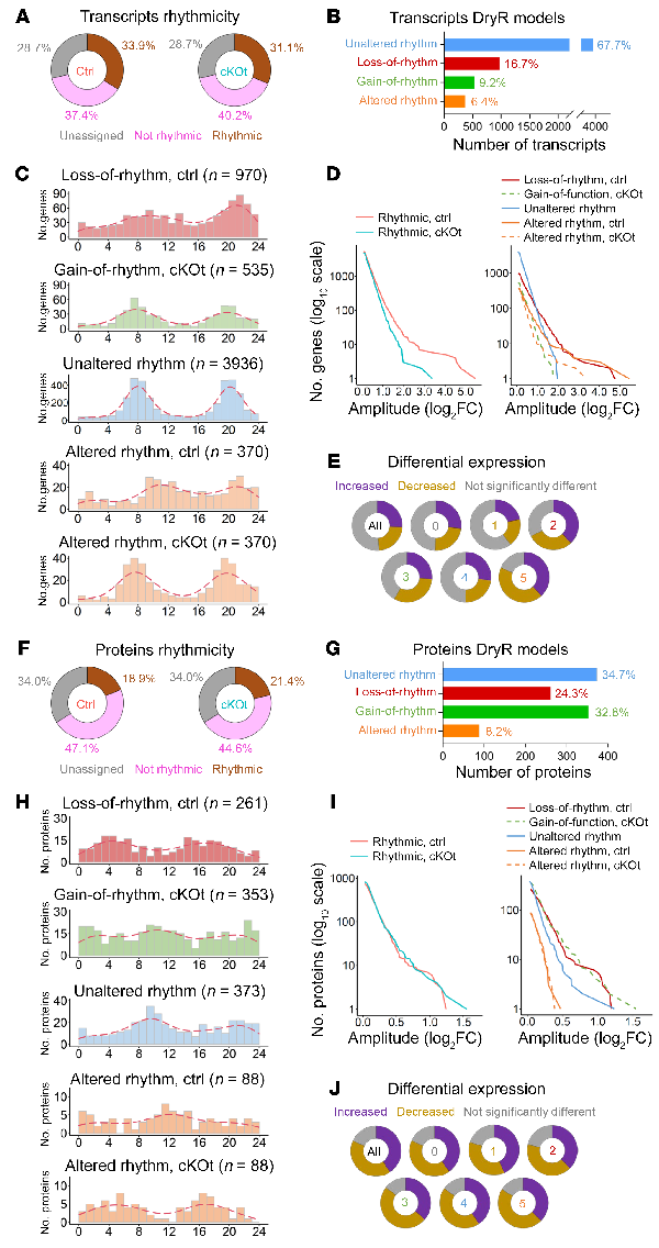 (A) Donut charts showing the percentage of rhythmic, nonrhythmic and unassigned renal transcripts in control (Ctrl) and cKOt mice. (B) Histogram showing the number and percentage of renal rhythmic transcripts assigned to dryR rhythmicity models. (C) Histogram showing the acrophase distribution of renal transcripts assigned to dryR rhythmicity models 2, 3, 4, and 5. Red dashed lines: kernel density estimates. (D) Cumulative number of renal transcripts assigned in the indicated rhythmicity pattern in function of amplitude. (E) Donut charts showing the proportion of renal transcripts displaying a differential mean expression according to limma R package () in Ctrl versus cKOt mice for each dryR rhythmicity model. (F) Donut charts showing the percentage of rhythmic, not rhythmic, and unassigned renal proteins in Ctrl and cKOt mice. (G) Histogram showing the number and percentage of renal rhythmic proteins assigned to dryR rhythmicity models. (H) Histogram showing the acrophase distribution of renal proteins assigned to dryR rhythmicity models 2, 3, 4, and 5. Red dashed lines: kernel density estimates. (I) Cumulative number of renal proteins assigned in the indicated rhythmicity pattern in function of amplitude. (J) Donut charts showing the proportion of renal proteins displaying a differential mean expression according to limma R package in control (Ctrl) versus cKOt mice for each dryR rhythmicity model.
