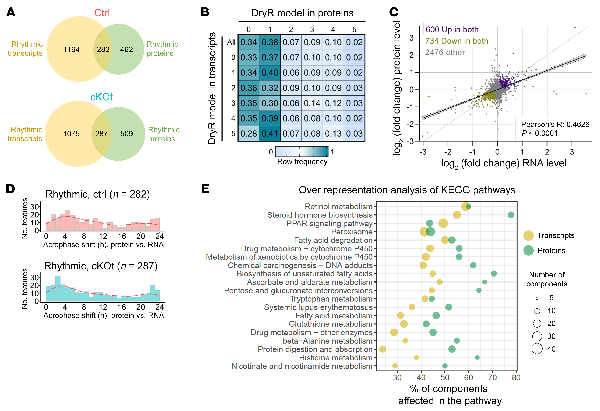 (A) Venn diagram showing the number of rhythmic transcripts and proteins among all detected pairs in control (Ctrl) and cKOt mice. (B) Table showing the frequency of transcripts and proteins pairs falling in the same dryR rhythmicity model. (C) Scatter plot and regression line with 95% confidence intervals of log2 fold changes in mean expression between Ctrl and cKOt mice at transcriptional (x axis) and protein (y axis) levels. (D) Histogram showing the distribution of the acrophase shift between transcripts and proteins in Ctrl (upper panel) or cKOt (lower panel) mice. Red dashed lines: kernel density estimates. (E) Scatter plot of all KEGG metabolic pathways significantly altered (Padj < 0.25) in both transcriptomic and proteomic renal data sets. Results are based on over representation analyses (ORA) of transcripts or proteins showing a significantly altered mean expression (Padj < 0.05 obtained with limma R package) with an absolute fold change > 1.2. The size of each dot depends on the number of transcripts or proteins, or components, of the pathway significantly affected in cKOt mice. Pathways are sorted from the lower to the higher value obtained by multiplication of Padj of both data sets.