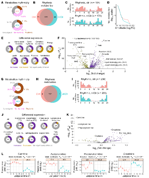 (A) Donut charts showing the percentage of rhythmic, nonrhythmic, and unassigned renal metabolites in control (Ctrl) and cKOt mice. (B) Venn diagram showing the number of rhythmic metabolites in kidneys of Ctrl and cKOt mice. (C) Histogram showing the acrophase distribution of rhythmic metabolites in kidneys of Ctrl and cKOt mice. Red dashed lines: kernel density estimates. (D) Cumulative number of rhythmic metabolites in Ctrl and cKOt mice in function of amplitude. (E) Donut charts showing the proportion of renal metabolites showing an increased, decreased, or not significantly altered mean level according to limma R package in cKOt versus Ctrl mice for each class of metabolites. (F) Volcano plot depicting metabolites significantly (Padj < 0.05) more abundant (purple dots) or less abundant (yellow dots) in kidneys of cKOt mice compared with Ctrl mice. (G) Donut charts showing the percentage of rhythmic, nonrhythmic, and unassigned plasma metabolites in Ctrl and cKOt mice. (H) Venn diagram showing the number of rhythmic metabolites in plasma of Ctrl and cKOt mice. (I) Histogram showing the acrophase distribution of rhythmic metabolites in plasma samples of Ctrl and cKOt mice. Red dashed lines: kernel density estimates. (J) Volcano plot depicting metabolites significantly (Padj < 0.05) more abundant (purple dots) or less abundant (yellow dots) in the plasma of cKOt mice compared with Ctrl mice. (K) Donut charts showing the proportion of plasma metabolites showing an increased, decreased, or not significantly altered mean level according to limma R package in cKOt versus Ctrl mice for each class of metabolite. (L) Temporal plots showing the plasma concentration, dryR rhythmicity model, and limma R package result of mean expression comparison between Ctrl and cKOt mice for carnitine, acetylcarnitine, propionylcarnitine, and creatinine in plasma metabolomes of Ctrl and cKOt mice.
