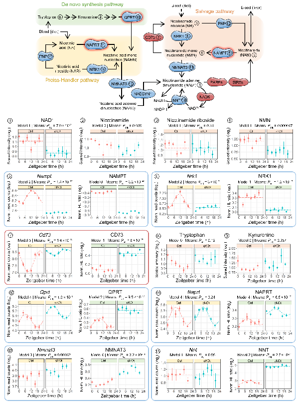 Schematic of the NAD+ metabolism depicting enzymes and metabolites involved in NAD+ synthesis from NAM, NAM riboside, nicotinic acid, and tryptophan (upper part). Enzymes in blue are involved in NAD+ synthesis, while enzymes in red are NAD+-consuming. Enzymes surrounded with red are rate limiting. Numbers link components of the pathway to temporal plots depicted in the lower part of the Figure. Temporal plots of major renal metabolites (peach), transcripts (yellow), and proteins (green) involved in NAD+ metabolism detected in renal transcriptomic, proteomic or metabolomic data sets in control (Ctrl) and cKOt mice. On each plot are mentioned the rhythmicity model and Padj obtained, respectively, from the dryR comparison of rhythmicity patterns and the limma R package mean expressions comparison in Ctrl and cKOt mice. CD73, cluster of differentiation 73 also known as ecto-5′-nucleotidase; NADK, NAD+ kinase; NADSYN1, glutamine-dependent NAD+ Synthetase; NAMPT, nicotinamide phosphoribosyltransferase; NAPRT, nicotinate phosphoribosyltransferase; NMNAT3, nicotinamide nucleotide adenylyltransferase isoform 3; NNT, NADP transhydrogenase; NRK1, nicotinamide riboside kinase 1; PARPs, poly(ADP-ribose) polymerases; PNP, purine nucleoside phosphorylase; QPRT, quinolinate phosphoribosyltransferase; SIRTs, sirtuins.