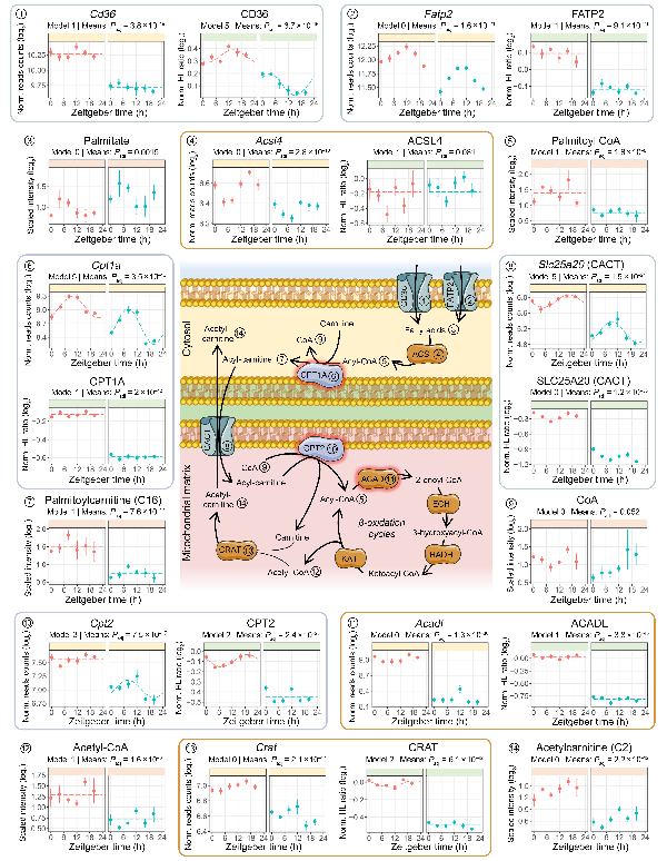 Schematic (center) and temporal plots (edges) of FA metabolism depicting major renal metabolites (peach), transcripts (yellow), and proteins (green) involved in FA entry and activation, acyl-carnitine shuttle into mitochondria, and acyl-CoA β-oxidation. Proteins surrounded with red are rate limiting. Numbers link components of the schematic to temporal plots. Rhythmicity model and Padj obtained, respectively, from the DryR comparison of rhythmicity pattern and limma R package mean expressions comparison in Ctrl and cKOt mice are mentioned in each plot. ACADL, acyl-coenzyme A dehydrogenase, long chain; ACSL4, acyl-CoA synthetase long chain family member 4; CACT, mitochondrial carnitine/acylcarnitine carrier protein; CD36, cluster of differentiation 36 also known as fatty acid translocase (FAT); CPT1A, Carnitine palmitoyltransferase 1A; CPT2, carnitine palmitoyltransferase 2; CRAT, carnitine O-acetyltransferase; FATP2, fatty acid transport protein 2.
