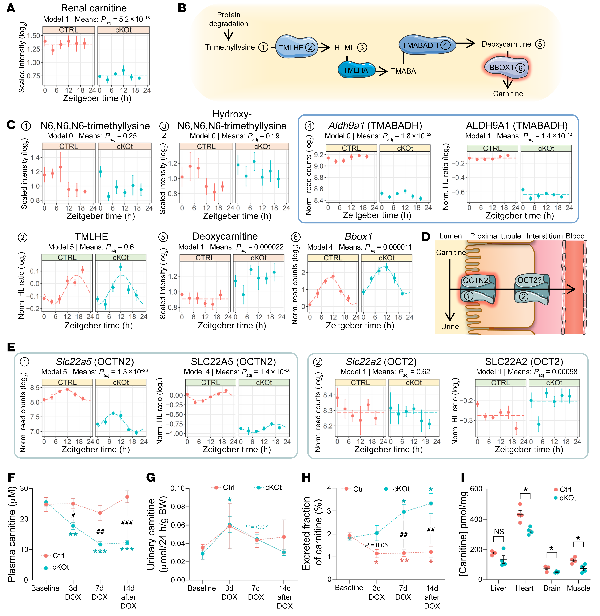 (A) Temporal plot showing the renal carnitine content in Ctrl and cKOt mice. (B) Schematic of renal carnitine synthesis pathway where BBOX1 (surrounded with red) is the rate limiting enzyme. (C) Temporal plots of major renal metabolites (peach), transcripts (yellow) and proteins (green) involved in carnitine synthesis detected in kidneys of Ctrl and cKOt mice. (D) Schematic of renal carnitine handling in proximal tubules: OCTN2 (SLC22A5) transporter (surrounded in red) is rate limiting for apical reabsorption of filtered carnitine. (E) Temporal plots showing the relative expression of renal carnitine transporters in kidneys of Ctrl and cKOt mice. Numbers link components of B to temporal plots. (F–H) Carnitine concentrations in plasma (F) or urine (G) and carnitine-excreted fraction (H) in Ctrl and cKOt mice before DOX treatment (baseline), 3 or 7 days after the beginning of the DOX treatment (3d or 7d DOX), and 2 weeks after the end of DOX treatment (14d post-DOX). (I) Carnitine content in liver, brain, skeletal muscle (right rectus femoris), and heart of Ctrl and cKOt mice 4 weeks after the end of DOX treatment. Throughout the Figure, the rhythmicity model obtained from dryR and Padj value obtained from limma mean expressions comparison in Ctrl and cKOt mice are mentioned on temporal plots. Results in panels F to I are mean ± SEM (n= 4 in each genotype) determined by 2-way ANOVA and Sidak’s multiple comparison posthoc tests. OCT2, organic cation transporter 2 (OCT2); BBOX1, γ-butyrobetaine hydroxylase 1; HTML, hydroxytrimethyllysine; OCTN2, organic cation transporter novel family member 2 (SLC22A5); TMABA, trimethylaminobutyraldehyde; TMABADH, trimethylaminobutyraldehyde dehydrogenase; TMLHA, hydroxyl-trimethyl-lysine aldolase; TMLHE, trimethyl-lysine hydrolase ε.