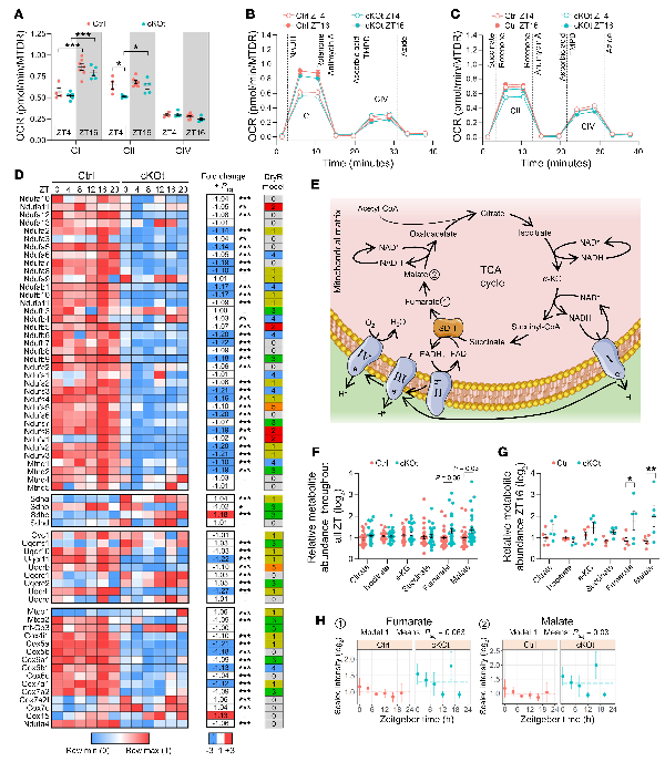 (A–C) Oxygen consumption rates (OCR) of mitochondrial respiratory chain complexes I (CI), II (CII) or IV (CIV) in the kidneys of Ctrl and cKOt mice at ZT4 and ZT16. In A, data are presented as individual values, with mean ± SEM determined by 2-way ANOVA and Sidak’s multiple comparison posthoc tests. In B and C, data are resented as mean ± SEM and vertical dashed lines depict time-points of metabolic substrates injection during OCR measurement. (D) Heatmaps showing the relative expression and the fold change in mean expression of proteins forming CI to CIV complexes in the kidneys of Ctrl and cKOt mice. Statistics determined by limma comparison at 6 circadian time-points. Fold changes ≥ 1.10 are depicted in blue or red. Rhythmicity models are shown to the right of the heatmap. (E) Schematic of the Tricarboxylic acid (TCA) cycle and electron transport chain in mitochondrial matrix. Numbers are related to plots in H. (F and G) Plots showing the relative abundance of major TCA cycle metabolites at 6 circadian time points (F) or at ZT16 (G) in kidneys of Ctrl and cKOt mice. Data are individual values with mean ± SEM. In F, means were compared using limma and Padj < 0.1 are shown. In G, means were compared using 2-tailed multiple t tests and resulting P values were corrected using the FDR approach (2-stage Step-up method of Benjamini, Krieger and Yekutieli). (H) Temporal plots of fumarate and malate abundance with corresponding rhythmicity model and Padj from dryR and limma comparisons in kidneys of Ctrl and cKOt mice. SDH, Succinate dehydrogenase. *P < 0.05; **P < 0.001; ***P < 0.0001.