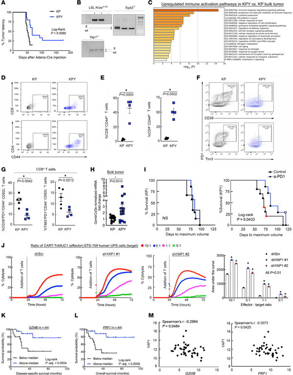 (A) Kaplan-Meier latency curves of KP and KPY UPS tumors (n > 10 per genotype). (B) Validation of genotypes from A (fl, floxed; wt, wild type). The Trp53fl and Yap1fl bands and their respective ladders are from the same gels but were separated for presentation. (C) Metascape pathway analysis of 5 unique bulk KP and KPY tumors. Includes all genes with greater than 2-fold expression increase in KPY versus KP, identified via microarrays. (D and E) Representative contour plots (D) and quantification (E) of CD8+CD44hi and CD4+CD44hi T cells in KP and KPY tumors. (F and G) Representative contour plots (F) and quantification (G) of CD39, Tim-3, and Pd1 expression in CD8+ T cells from KP and KPY tumors. For E and G, points represent individual tumors; 2-tailed unpaired t tests. (H) Gzmb quantitative reverse transcriptase PCR (qRT-PCR) in bulk KP and KPY tumors; 2-tailed unpaired t test. (I) Kaplan-Meier survival curves of KP and KPY mice treated with α-Pd1 or control. Red and black circles in control curves indicate IgG-injected and uninjected mice, respectively. Open circle, mouse with durable tumor regression; x axis, days to maximum volume since adeno Cre injection. (J) Average longitudinal cytolysis of shScr or shYAP1 human STS-109 UPS cells during coculture with CART-TnMUC1 cells from 3 independent human donors. Measurements indicate percent target (UPS) cell cytolysis. Quantification: 1-way ANOVA with Dunnett’s test (vs. shScr) for each ratio. Points for individual replicates overlap. shScr data are identical to those in Figure 3, D and E (performed in the same experiment). (K and L) Kaplan-Meier survival curves of UPS patients in TCGA-SARC stratified by intratumoral GZMB (K) and PRF1 (L) expression. (M) Correlation of YAP1 with GZMB and PRF1 gene expression in UPS tumors from TCGA-SARC.