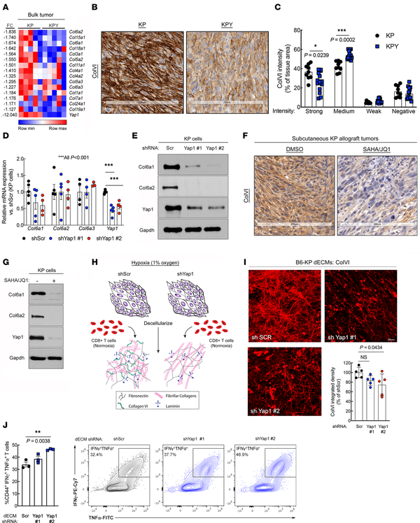 (A) Heatmap of gene expression microarray data comparing 5 unique KP and KPY bulk tumors. The top one-third of collagen-encoding genes modulated by Yap1 deletion are displayed. Supplemental Figure 3D shows the remaining two-thirds of collagen-encoding genes. FC, fold change. (B and C) Representative images (B) and quantification (C) of ColVI IHC in KP and KPY tumors; 2-tailed unpaired t tests with Welch’s correction and Holm-Šidák multiple-comparison test (n = 3–5 mice per genotype with 3 sections per mouse). Scale bars: 200 μm. (D) qRT-PCR of Col6a1, Col6a2, Col6a3, and Yap1 gene expression in KP cells expressing a control or one of multiple independent Yap1-targeting shRNAs; 1-way ANOVA with Dunnett’s test (vs. shScr) for each gene. (E) Representative immunoblot of KP cells treated as in D. (F) Representative images of ColVI IHC in KP tumor–bearing mice treated with 25 mg/kg SAHA plus 50 mg/kg JQ1 or vehicle control for 20 days. Quantification is in Supplemental Figure 3M. Scale bars: 200 μm. (G) Representative immunoblot of KP cells treated with SAHA (2 μM) plus JQ1 (0.5 μM) or vehicle control for 48 hours. (H) Schematic of experimental model to assess immunomodulatory role of UPS cell–derived decellularized extracellular matrix (dECM). (I) Representative wide-field images and quantification of ColVI deposition in dECM from KP cells expressing control or Yap1-targeting shRNAs; 1-way ANOVA with Dunnett’s test (vs. shScr). Scale bar: 25 μm. Image brightness and contrast were adjusted for publication. (J) Quantification and representative contour plots showing IFN-γ and TNF-α coexpression in CD44+CD8+ T cells incubated on dECMs from control and shYap1-expressing KP cells. Each point represents T cells isolated from an individual mouse. One-way ANOVA with Dunnett’s test (vs. shScr). The shScr plot and data are identical to those in Figure 5A (performed in the same experiment).
