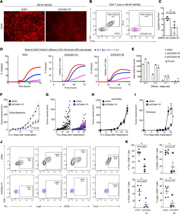 (A) Representative wide-field images of ColVI immunofluorescence in dECMs generated from control and shCol6a1-expressing B6-KP cells. Scale bars: 20 μm. Brightness and contrast were adjusted for publication. (B and C) Representative contour plots (B) and quantification (C) of Pd1 and Tim-3 coexpression in CD44+CD8+ T cells incubated on dECM derived from control or shCol6a1 KP cells. (D) Average longitudinal cytolysis of shScr- or shCOL6A1-expressing human STS-109 UPS cells cocultured with CART-TnMUC1 cells from 3 independent human donors (n = 2 for shCOL6A1 #1). Points for individual replicates overlap. Measurements indicate percent target cell (UPS cell) cytolysis. (E) Quantification of area under the curve from D; 1-way ANOVA with Dunnett’s test (vs. shScr) for each ratio. In D and E, shScr data are identical to those in Figure 1J (performed in the same experiment). (F) Tumor growth curves from subcutaneous (flank) syngeneic transplant of 3 × 104 B6-KP cells in Matrigel expressing control or Col6a1-targeting shRNAs in syngeneic C57BL/6 mice; 2-way ANOVA. (G) Individual tumors from F. (H) Tumor growth curves depicting subcutaneous (flank) syngeneic transplant of 5 × 105 KP cells (SKPY42.1 cell line) expressing control or Col6a1-targeting shRNAs in C57BL/6 mice treated with α-CD8α every 3 days. (I) Tumor growth curves depicting syngeneic orthotopic transplant (into the gastrocnemius muscle) of 2.5 × 105 KP cells (SKPY42.1 cell line) expressing control or Col6a1-targeting shRNAs in C57BL/6 mice; 2-way repeated-measures ANOVA, SEM. (J and K) Representative contour plots (J) and quantification (K) of T cell dysfunction markers in CD8+ T cells from control and shCol6a1 orthotopic tumors from I. Each point in K represents an individual tumor. Two-tailed unpaired t tests.