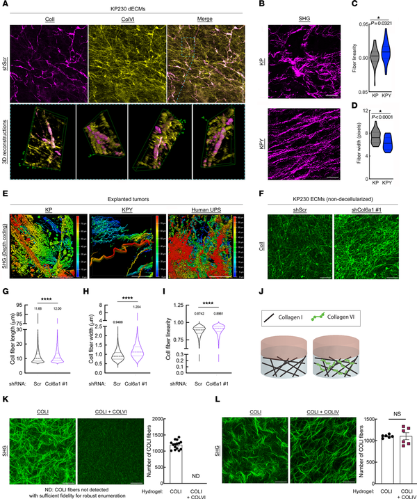 (A) Representative confocal micrographs (maximum-intensity Z-projections) and 3D reconstructions showing ColI and ColVI coimmunofluorescence in KP cell–derived dECMs. Scale bar: 100 μm. (B) Representative multiphoton second-harmonic generation (SHG) images (maximum-intensity Z-projections) of KP and KPY tumor sections. Scale bars: 50 μm. (C and D) Violin plots of CT-FIRE analysis of images from B. Mean fiber width and linearity were plotted for at least 5 separate fields (n = 5 mice per genotype); 2-tailed unpaired t test. (E) Representative depth-coded SHG images of human UPS, KP, and KPY explanted live tumors. Red, SHG signal farthest from the objective/greatest relative tissue depth; blue, SHG signal closest to the objective/shallowest relative tissue depth. Scale bars: 50 μm. (F) Representative confocal micrographs (maximum-intensity Z-projections) of extracellular ColI immunofluorescence in ECMs (non-decellularized) generated from control and shCol6a1 KP cells. Scale bars: 50 μm. (G–I) Violin plots depicting CT-FIRE analysis of images in F. Fiber length (G), width (H), and linearity (I) were plotted from 7 independent fields across multiple dECMs per condition. Numbers above violin plots indicate means. Thick and thin dotted lines within the shapes denote medians and quartiles 1 and 3, respectively. (J) Schematic of in vitro hydrogel system to assess how purified COLVI impacts purified COLI structure/organization. (K) Representative SHG images (maximum-intensity Z-projections with ×2 optical zoom) and quantification of COLI fiber number in COLI-alone and COLI plus COLVI hydrogels. Scale bars: 50 μm. (L) Representative SHG images (maximum-intensity Z-projections with ×2 optical zoom) and quantification of COLI fiber number in COLI-alone and COLI plus COLIV hydrogels. Scale bars: 50 μm. For K and L, quantification was performed for at least 6 independent fields across multiple hydrogels per condition. Brightness and contrast of all micrographs in Figure 4 were adjusted for publication.
