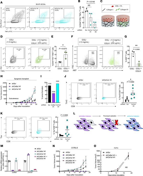 (A and B) Representative flow cytometry plots (A) and quantification (B) of IFN-γ and TNF-α coexpression in CD44+CD8+ T cells incubated on dECMs from control or shCol1a1 KP cells. Each point represents T cells from an individual mouse; 1-way ANOVA with Dunnett’s test vs. shScr. The shScr plot and data are identical to those in Figure 2J (performed in the same experiment). (C) Schematic of in vitro hydrogel system to test how ColI impacts ColVI-mediated CD8+ T cell dysfunction. CTL, cytotoxic T lymphocyte. (D and E) Representative flow cytometry plots (D) and quantification (E) of activated human CD8+CD44+ T cells showing TIM-3 and PD-1 coexpression after incubation on hydrogels containing purified COLI with or without purified COLVI; 2-tailed unpaired t test. (F and G) Representative flow cytometry plots (F) and quantification (G) of Ki67 in activated human CD8+CD44+ T cells cultured as in D and E; 2-tailed unpaired t test. (H) Tumor growth curves from subcutaneous (flank) syngeneic transplant of 5 × 105 KP cells (SKPY42.1 cell line) expressing control, Col6a1, or Col1a1-targeting shRNAs in C57BL/6 mice. Data are from 2 independent experiments (total n = 20 for shScr and shCol1a1; n = 39 for shCol6a1). (I) Tumor formation rates from H. (J and K) Representative contour plots and quantification of Tim-3 (J) and Tox (K) expression in CD8+ T cells in tumors from H. Each point represents an individual tumor; 2-tailed unpaired t test with Welch’s correction. (L) Schematic depicting strategy for depleting Col6a1 and Col1a1 in the same UPS cell population. (M) Validation of Col6a1 and Col1a1 expression in UPS cells from L (SKPY42.1 cell line). Technical replicates. (N and O) Tumor growth curves from subcutaneous syngeneic transplant of 1 × 106 KP cells (SKPY42.1 cell line) from M in C57BL/6 (N) and nu/nu (O) mice.