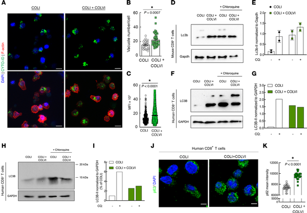 To date, an immunosuppressive role of ColVI has not been documented in tumors. We therefore sought to identify the downstream mechanism by which ColVI deposition causes T cell dysfunction, and were intrigued by the reported ability of ColVI to modulate autophagy in fibroblasts and muscle tissue (). Indeed, autophagy is a central regulator of T cell metabolism and is essential for T cell activation (). To assess whether ColVI impacted CD8+ T cell autophagy, we encapsulated T cells in purified COLVI-containing hydrogels and visualized autophagosomes in situ. T cell autophagosomes were brighter and more numerous in the presence of COLVI versus COLI alone (Figure 6, A–C). To determine whether COLVI caused autophagosome accumulation by inducing autophagy or by disrupting autophagic flux and autophagosome clearance, we treated activated CD8+ T cells with chloroquine (CQ) in the presence or absence of COLVI and evaluated LC3B-II expression. In murine T cells, inhibiting autophagic flux with CQ did not further increase Lc3b-II, indicating that COLVI disrupts autophagic flux but does not induce autophagy (Figure 6, D and E). Activated human peripheral blood CD8+ T cells generally showed the same trend (Figure 6, F–I). We confirmed this result by staining for p62, a protein rapidly degraded during autophagy induction. In the presence of COLVI, p62 accumulated within T cells as evidenced by increased mean p62 signal intensity (Figure 6, J and K). Together, these results indicate that extracellular COLVI inhibits CD8+ T cell autophagic flux.