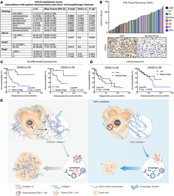 Finally, we explored the relationship between COLVI expression in UPS and other sarcoma subtypes using a tissue microarray (TMA). The mean UPS COLVI H-score (88.52; range, 105.73) was higher than those of all other subtypes, and significantly greater than those of leiomyosarcomas, neurofibromas, and synovial sarcomas (Figure 8, A and B). Importantly, the dynamic range of COLVI staining in the UPS TMA cohort was similar to that in the HUP cohort (Figure 7, J and K; range, 142.94). As UPS is more prevalent among older adults and presents with aggressive clinical features (), we adjusted associations between COLVI H-score and histology for patient age, tumor grade, and tumor stage (Figure 8A). After controlling for these variables, relationships between COLVI H-score and histologic subtype were attenuated but remained statistically significant. Tumor grade was also significantly associated with COLVI H-score in univariate models. Furthermore, in TCGA-SARC, COL6A1 gene expression was associated with reduced long-term survival among liposarcoma patients, where tumor COLVI expression levels are similar to those in UPS, but not among leiomyosarcoma patients, where tumor COLVI levels are significantly lower (Figure 8, C and D). Thus, COLVI expression may be a biomarker of clinical outcomes and immunotherapy sensitivity in some human sarcoma patients.