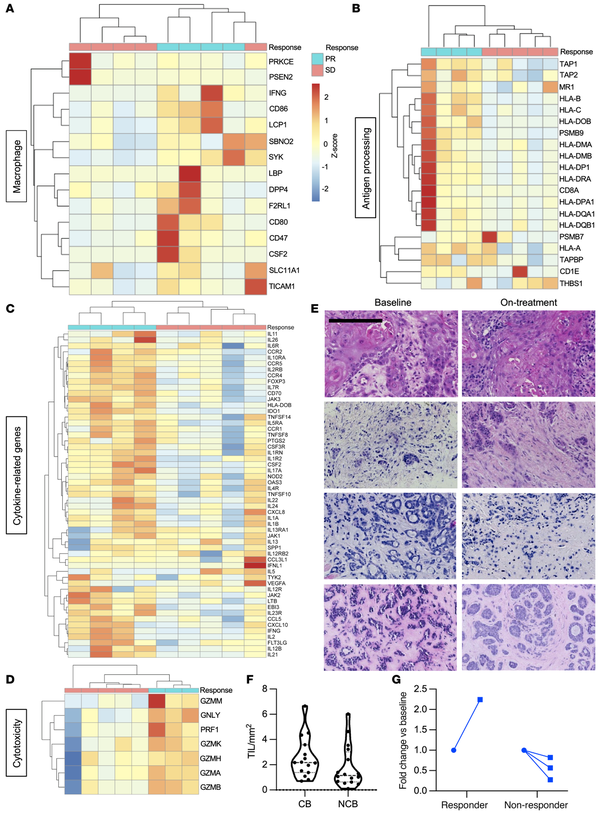 (A) Heatmap of macrophage-related gene expression in baseline tumor biopsies. (B) Heatmap of antigen processing–related transcripts in baseline biopsies. The first column represents the participant shown in Figure 2D, with high mutational burden. (C) Heatmap of cytokine-related gene expression in baseline tumor biopsies. Scale = z score, scaled by row. (D) Heatmap of cytotoxicity signature in on-treatment biopsies. (E) Representative images of tumor micrographs quantified in G. Top 3 rows: participants with SD. Lower row: participant with PR. Scale bar: 200 μm. (F) Stromal TIL count in H&E sections of patients who experienced clinical benefit (CB) (defined as PR or >16 weeks on study) compared with those who did not. (G) Fold change in stromal TILs in a responding patient and 2 nonresponding patients.