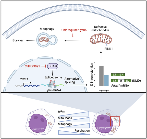 Together, these data support the hypothesis that aberrant splicing of PINK1 caused by GSK-3i reduces PINK1 expression and inhibits clearance of defective mitochondria in SRSF2 mutant cells, disrupting the homeostatic balance required for survival. Targeting mitophagy therefore represents a promising therapeutic strategy to eradicate SRSF2-mutant hematologic malignancies (Figure 8).