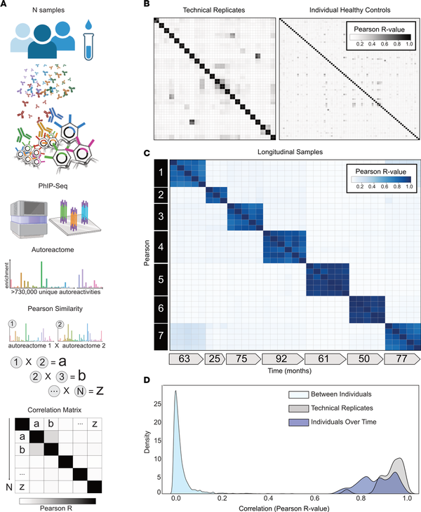 Figure 1. (A) Graphical representation of the analytical approach to quantitatively compare individual samples’ unique proteome-wide autoantibody signal (“Autoreactome,” containing up to 730,000 unique autoreactivities) to any other sample. (B) Correlation matrices showing Pearson’s correlation coefficients of complete PhIP-Seq signal in healthy individuals. Left: 48 samples representing 24 individuals in technical replicate (same data set as used in A). Right: 79 distinct individuals. (C) Correlation matrix showing Pearson’s r values for complete PhIP-Seq enrichment in 7 distinct individuals, each of whom have serial samples over at least 3 years. (D) Kernel density estimate plot showing distribution of Pearson’s r correlation coefficients among technical replicates, individuals over time, and between different individuals.