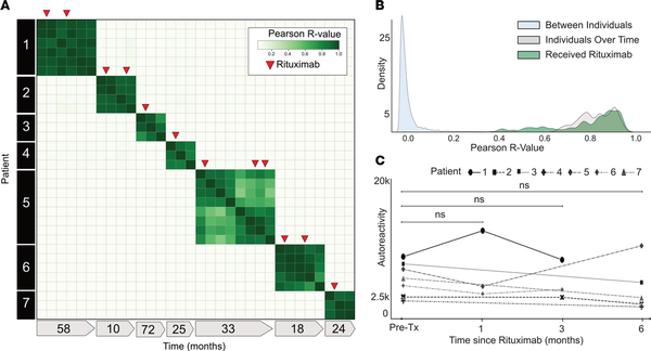 (A) Correlation matrix showing Pearson’s r values of complete PhIP-Seq signal in 7 distinct individuals with myasthenia gravis, each of whom were either rituximab naive or had not received rituximab for more than 6 months prior to first sample collection. Red arrows represent administration of rituximab. (B) Kernel density estimate plot showing distribution of Pearson’s r value correlation coefficients among longitudinal samples from individuals receiving rituximab relative to longitudinal samples from individuals received no intervention. (C) Line plots showing the autoreactivity (sum of top 10 PhIP-Seq Z scores relative to the 79 individuals acting as healthy controls) for each patient over the first 6 months following the initial rituximab dose. One-way paired-sample Wilcoxon’s test, P = 0.625 at 1 month, 0.125 at 3 months, and 0.3125 at 6 months.