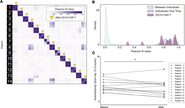 (A) Correlation matrix showing Pearson’s r values of complete PhIP-Seq signal in 14 distinct individuals before and after anti-CD19 CAR T cell therapy. Yellow arrows represent the 6-month posttreatment time point. (B) Kernel density estimate plot showing distribution of correlation coefficients within each individual before and after therapy relative to the distribution among untreated individuals over time and between different individuals. (C) Line plots showing the autoreactivity (sum of top 10 PhIP-Seq Z scores relative to the 79 healthy controls) for each patient before and after treatment. One-sided paired-sample Wilcoxon’s test, P = 0.021.