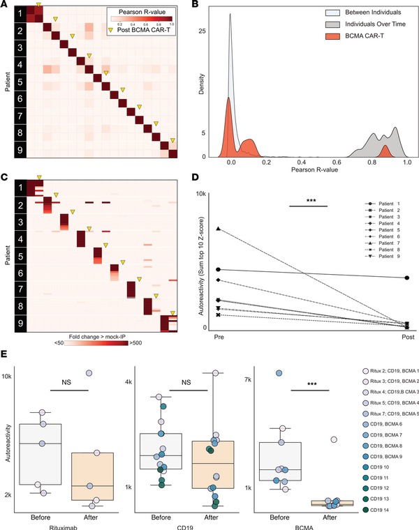 (A) Correlation matrix showing Pearson’s r values of complete PhIP-Seq signal in 9 distinct individuals before and after anti-BCMA CAR T cell therapy. Yellow arrows represent the 6-month posttreatment time point. (B) Kernel density estimate plot showing distribution of correlation coefficients within each individual before and after BCMA-targeted therapy relative to the distribution among untreated individuals over time and the distribution between different individuals. (C) Heatmap showing top 10 autoreactivities (sum of top 10 PhIP-Seq Z scores relative to the 79 individuals acting as healthy controls) in each individual before and after treatment. (D) Line plots showing the autoreactivity (sum of top 3–12 PhIP-Seq Z scores relative to the 79 healthy controls, therefore accounting for potential paraprotein confounding) for each patient before and after treatment. One-sided paired-sample Wilcoxon’s test, P = 0.0019. (E) Box plots showing the relative distributions of autoreactivity before and after treatment with rituximab (sum of top 10), anti-CD19 CAR T cell therapy (sum of top 10), and anti-BCMA CAR T cell therapy (sum of top 3 through 12 autoreactivities). Anti-BCMA CAR T cell treatment cohort, Mann-Whitney U, P = 0.42, with a median percentage decrease of 52.3%; anti-CD19 CAR T cell treatment cohort, Mann-Whitney U, P = 0.206, with a median percentage decrease of 11.9%; and anti-BCMA CAR T cell treatment cohort, Mann-Whitney U, P = 0.003, with a median percentage decrease of 95.6%. ***P < 0.005.