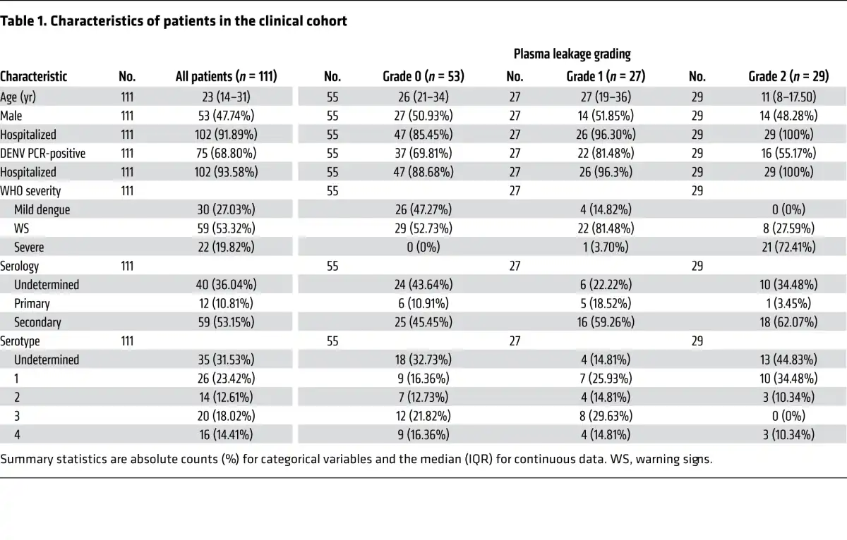 A nested case-control study was performed using stored plasma samples from a prospective study that enrolled 316 patients from both outpatient facilities and inpatient wards at the Hospital for Tropical Disease (HTD) (Ho Chi Minh City, Vietnam) and the National Hospital for Tropical Diseases (NHTD) (Hanoi, Vietnam) (). From this cohort, we randomly selected 111 patients including 56 with plasma leakage (29 patients with grade 2 and 27 patients with grade 1) compared with 53 patients without evidence of leakage. Patients were included if they had sufficient plasma stored for more than 1 time point and all the clinical data required for the grading of plasma leakage. Patients were classified into 3 predefined categories of increasing disease severity as indicated by plasma leakage: grade 0, no evidence of leakage; grade 1, a 15%–20% increase in HCT and/or fluid accumulation; grade 2, evidence of severe leakage including an HCT increase of greater than 20%, DSS, or compromised respiratory function. Dengue diagnostics for the NS1 test (Platelia ELISA, Bio-Rad), Ig serology, and RT-PCR were described in the original publication ().