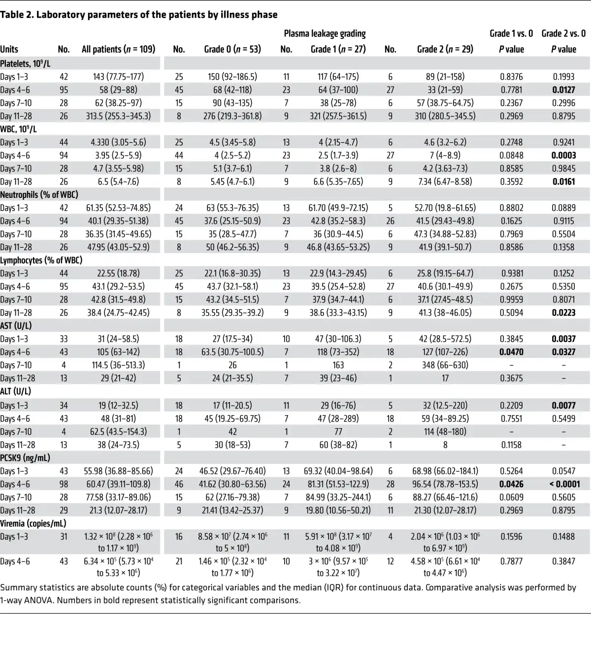 To verify that our in vitro findings were clinically pertinent, we examined the association between plasma PCSK9 levels, DENV viremia, and disease severity in a nested case-control study using a previously described prospectively enrolled cohort of patients with dengue (). A total of 314 patients with suspected dengue were enrolled at 2 Vietnamese hospitals, either as outpatients with less than 72 hours of fever, or after hospitalization. Of these, 263 patients were laboratory-confirmed dengue cases (ref. and Table 1). A subset of 111 individuals with good clinical and basic laboratory data (serial measurements of platelet, WBC, neutrophil and lymphocyte counts in whole blood, serum aspartate aminotransferase [AST] and alanine transaminase [ALT] levels, as well as plasma viremia, as measured by quantitative reverse transcription PCR [qRT-PCR] at enrollment) and availability of residual plasma for PCSK9 measurements were included in this analysis. PCSK9 levels in each patient were measured at 3 time points (1–3 days after illness onset, 4–6 days after illness onset and at convalescence, and 10–14 days after illness onset) (Table 2). Patients were classified into 3 predefined categories of increasing disease severity in terms of plasma leakage: grade 0, no evidence of leakage; grade 1, an increase of 15%–20% in hematocrit (HCT) and/or fluid accumulation and; grade 2, development of severe leakage including an HCT increase of more than 20%, dengue shock syndrome (DSS), or compromised respiratory function. Relevant clinical details on the 111 patients analyzed in this study are provided in Table 1. Consistent with previous findings, platelet counts were significantly lower in patients with grade 2 compared with grade 0 plasma leakage 4–6 days after illness onset, which is around the period of defervescence when signs of severe dengue commonly manifest (Figure 5A).