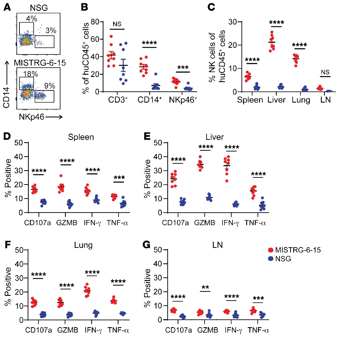 (A) Representative flow cytometry plots of NKp46+ and CD14+ cells in blood between MISTRG-6-15 and NSG mice. (B) Percentage of CD3+, CD14+, and NKp46+ cells in blood. Cells were gated on human CD45+ population. (C) Percentage of CD3–CD56+ NK cells (defined by CD56 and not NKp46, to reduce inclusion of group 1 and 3 innate lymphoid cells) in spleen, liver, lung, and LN. Cells were gated on human CD45+ population. (D–F) Percentage of CD107a+, GZMB+, IFNγ+, and TNFα+ NK cells in spleen (D), liver (E), lung (F), and LN (G) after 4 hours of ex vivo stimulation with PMA/ionomycin. Data displayed as mean ± SEM. 8 mice per group. P values were calculated using 2-way ANOVA with Šidák’s multiple comparison test. **P < 0.01, ***P < 0.001, and ****P < 0.0001.