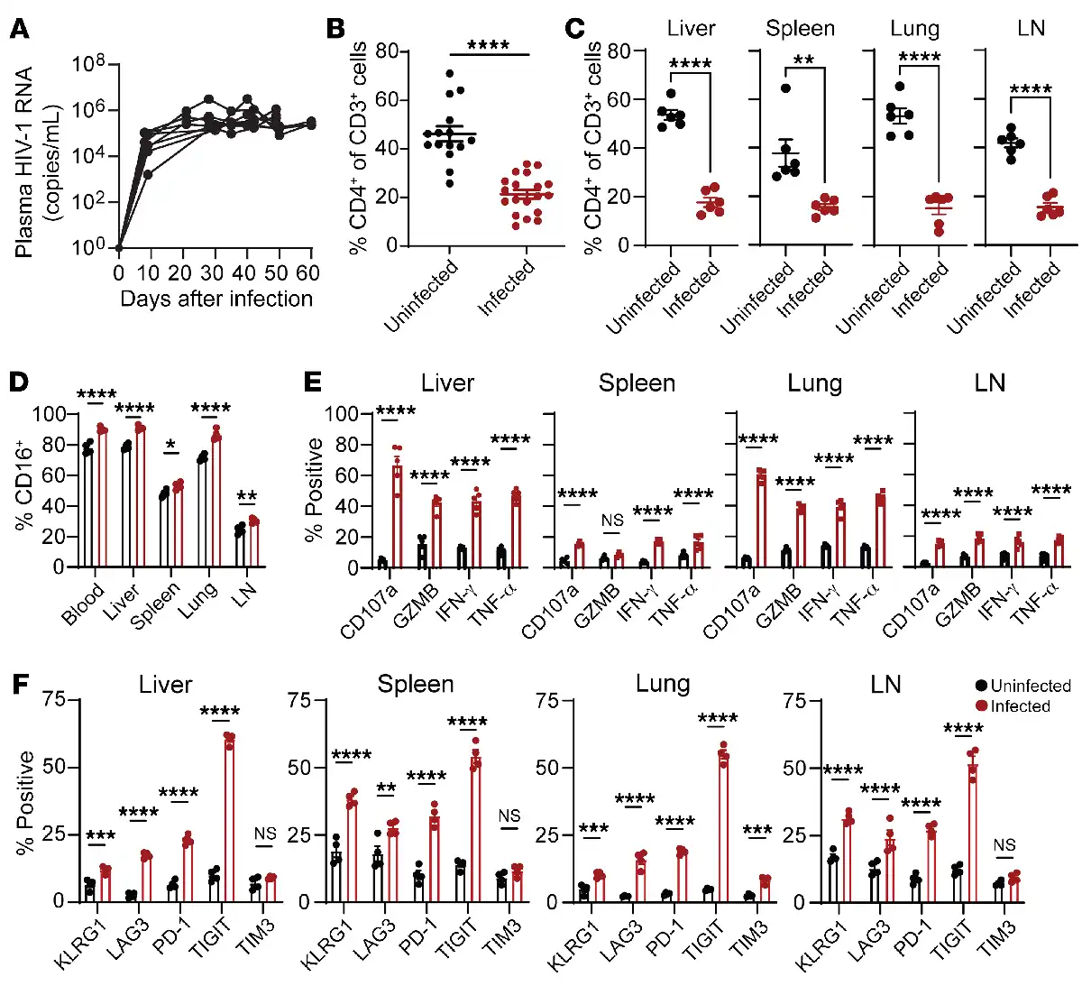 During acute HIV-1 infection in humanized MISTRG-6-15 mice, NK cells rapidly expanded, and greater percentages of cells degranulated and produced inflammatory cytokines in nonlymphoid tissues, while those in lymphoid tissues were immature or dysfunctional throughout the course of infection. This was consistent with results in humans and studies of nonhuman primates infected with SIV (). This highlights a key concern of HIV-1 persistence in lymphoid tissue (, , ), as overall, the NK cells appear to be less cytotoxic and proinflammatory. In chronically infected mice, the functions of NK cells declined in various tested organs, which was accompanied by an increase in potential NK exhaustion markers in all of the organs studied, which may allude to overall dampened response to HIV-1 by these cells over time. The dampened response was partially reduced after ART, which resulted in the return of functional NK cells after treatment interruption. It is notable that NK cells in the LNs were not strongly affected by ART; this suggests that either (a) overall, NK cells minimally responded to HIV-1 in the lymphoid tissue initially or (b) immunological stimulation was continuous due to the persistence of HIV-1–infected cells in the lymphoid tissues despite ART ().