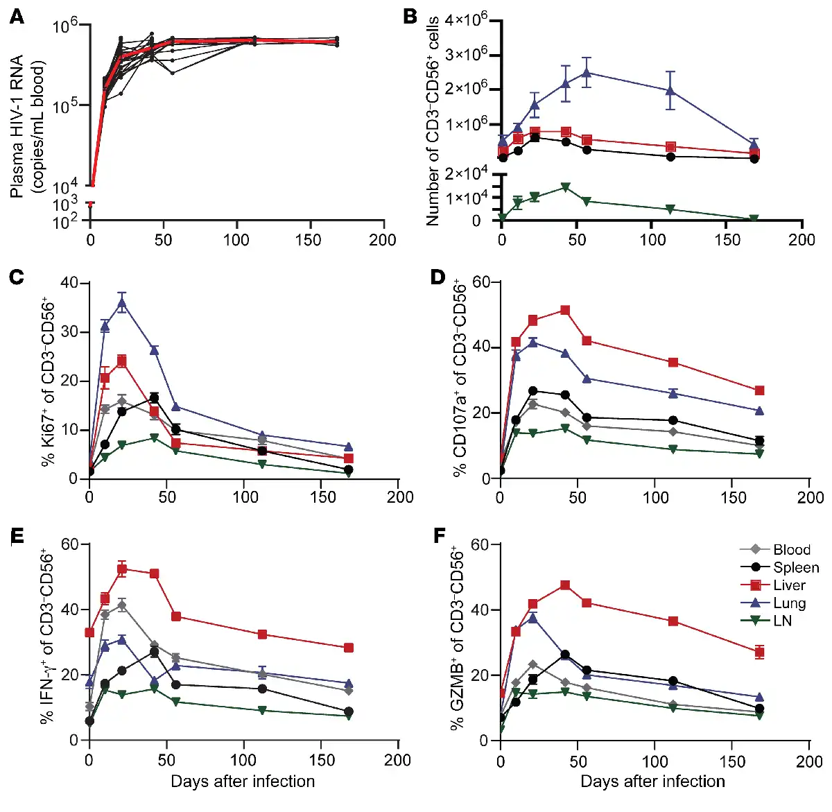MISTRG-6-15 mice were infected with HIV-1BAL. On days 0, 10, 21, 42, 56, 112, and 168 after infection, 4–6 mice at each time point were euthanized for blood and tissue collection. (A) Plasma HIV-1 RNA levels; red line illustrates the average. (B) Number of human NK cells (huCD45+CD3–CD56+) throughout the course of infection in spleen, liver, lung, and LN. (C–F) Ki67, CD107a, IFN-γ, and GZMB expression by NK cells in blood, spleen, liver, lung, and LN. NK cells purified from tissues were stimulated with PMA/ionomycin ex vivo for 4 hours before flow cytometry analysis. Data displayed as mean ± SEM.