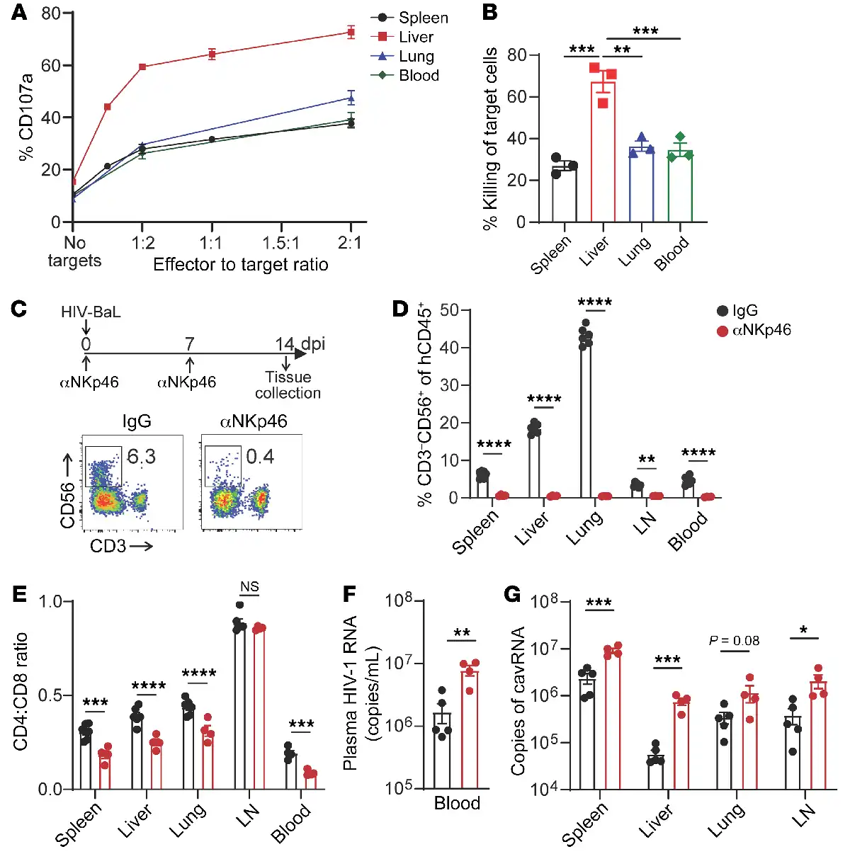 Spleens, livers, and submandibular, axillary, and thoracic LNs were excised from mice and filtered through 100 μm strainers using the back end of a syringe. The strainer was washed with tissue buffer made of PBS with FBS. Samples were centrifuged followed by resuspension of the pellet in tissue buffer. For livers, cells were resuspended in 8 mL of tissue buffer and 5 mL of 100% percoll and then centrifuged for 20 minutes at 760g. Lungs were excised and cut into small pieces with scissors. They were then incubated at 37°C with digestion buffer contained collagenase and DNase I for 45 minutes. Samples were then filtered through 100 μm strainers using the back end of a syringe. The strainer was washed with tissue buffer. Samples were centrifuged followed by resuspension of pellet in 10 mL of 40% percoll. Samples were centrifuged for 20 minutes at 760g. After single-cell suspensions from all tissues were obtained, cells were utilized for 3 purposes, including ICR staining, intracellular cytokine staining, and target cell lysis. ICR staining was performed using freshly isolated cells. For intracellular cytokine production, cells were stimulated with PMA (50 ng/mL) and ionomycin (500 ng/mL) and stained with anti-CD107a antibody for 4 hours. Brefeldin A and monensin (golgiplug) were used for the final hour of stimulation. Cells were then washed and stained with CD56, CD3, CD8, NKp44, and CD16. Cytofix/Cytoperm kit (BD Biosciences) was then utilized and intracellular staining was performed with IFN-γ, TNF-α and GZMB (Supplemental Figure 11). Purified NK cells were used to assess target cell lysis. To purify NK cells from mice, single cell suspensions were obtained from specified organs as outlined above followed by elimination of CD45+ mouse cells with EasySep Mouse CD45 Positive Selection Kit (Stemcell Technologies) followed by NK cell isolation using EasySep Human NK Cell Isolation Kit (Stemcell Technologies). Purified NK cells were coincubated with CFSE-labeled (Thermo Fisher Scientific) K562 cells (ATCC), with effector-to-target ratios of 1:2, for 4 hours, and cytotoxicity was assayed by 7-AAD uptake. Background spontaneous K562 blast death (measured via the no effector control wells) was subtracted from the total to yield the percentage of K562 cell–specific cytotoxicity. For experiments investigating perforin-mediated killing, concanamycin A (Sigma-Aldrich) was utilized at 100 nM with cells incubated for 120 minutes prior to the killing assay. To determine lysis of HIV-1–infected target cells, NK cells and CD4+ T cells were purified separately from mice engrafted with CD34+ cells from the same cord blood donor. Purified CD4+ T cells were infected with the HIV-1 reporter virus NL4-3-ΔEnv-EGFP for 3 days. Infected cells were then cocultured with freshly isolated NK cells from various tissues in a 1:1 effector-to-target ratio for 4 hours and cytotoxicity was assayed by 7-AAD uptake in GFP+ cells.