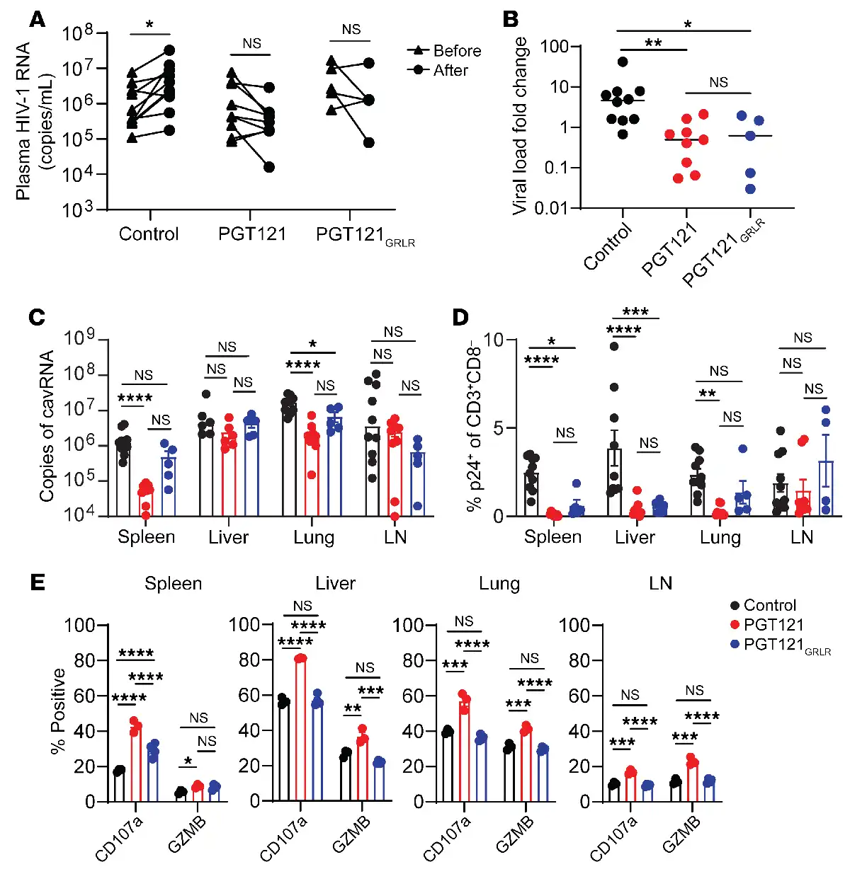 Administration of broadly neutralizing antibodies (bNab) into viremic individuals enhances viral-specific T cell responses (–) and may also modulate NK cell functions through Fc-dependent mechanisms. To address the potential role that bNab therapy may have on NK responses, we used the HIV-neutralizing antibody PGT121 () to understand the Fc-dependent NK cell functions. Although IgM+ or IgD+ human B cells develop properly in most humanized mice, a scarce amount of hypermutated, class-switched IgG antibodies are produced, mainly due to the lack of germinal center response (), necessitating a passive antibody treatment approach to study ADCC by NK cells. Moreover, we also used PGT12 with GRLR mutations that block antibody binding to Fc receptors (). PGT121 or PGT121GRLR was injected into infected mice, and viral loads in the plasma were reduced by both antibodies (Figure 7, A and B). In mice treated with PGT121, the spleen and lung had greater reduction of cavRNA and numbers of infected cells than the PGT121GRLR group (Figure 7, C and D), indicating Fc-dependent clearance of HIV-1–infected cells. No reduction was seen in the LNs, likely due to the lack of functionally mature NK cells in the LNs. Surprisingly, the number of HIV-p24+ cells in the liver was reduced by PGT121, whereas liver HIV-1 RNA was unchanged. It is possible that HIV-1 RNA signals were detected from kupffer cells that engulfed HIV-1–infected T cells upon antibody treatment. Since the GRLR mutation abolishes both ADCC (Supplemental Figure 4) and ADCP (), it is possible that macrophages and NK cells both contributed to the clearance of HIV-1–infected cells mediated by PGT121 interacting with the intact Fc fragment. Next, we aimed to evaluate the influence of antibody therapy on NK cells. NK cell functions such as degranulation and GzmB production were selectively enhanced by PGT121 in the spleen, liver, and lung, and were slightly enhanced in the lymph nodes. By contrast, the PGT121GRLR did not have any effect on NK cell functionality (Figure 7E). These results support the hypothesis that antibody therapies improve NK cell cytolytic activity in an Fc-dependent manner.