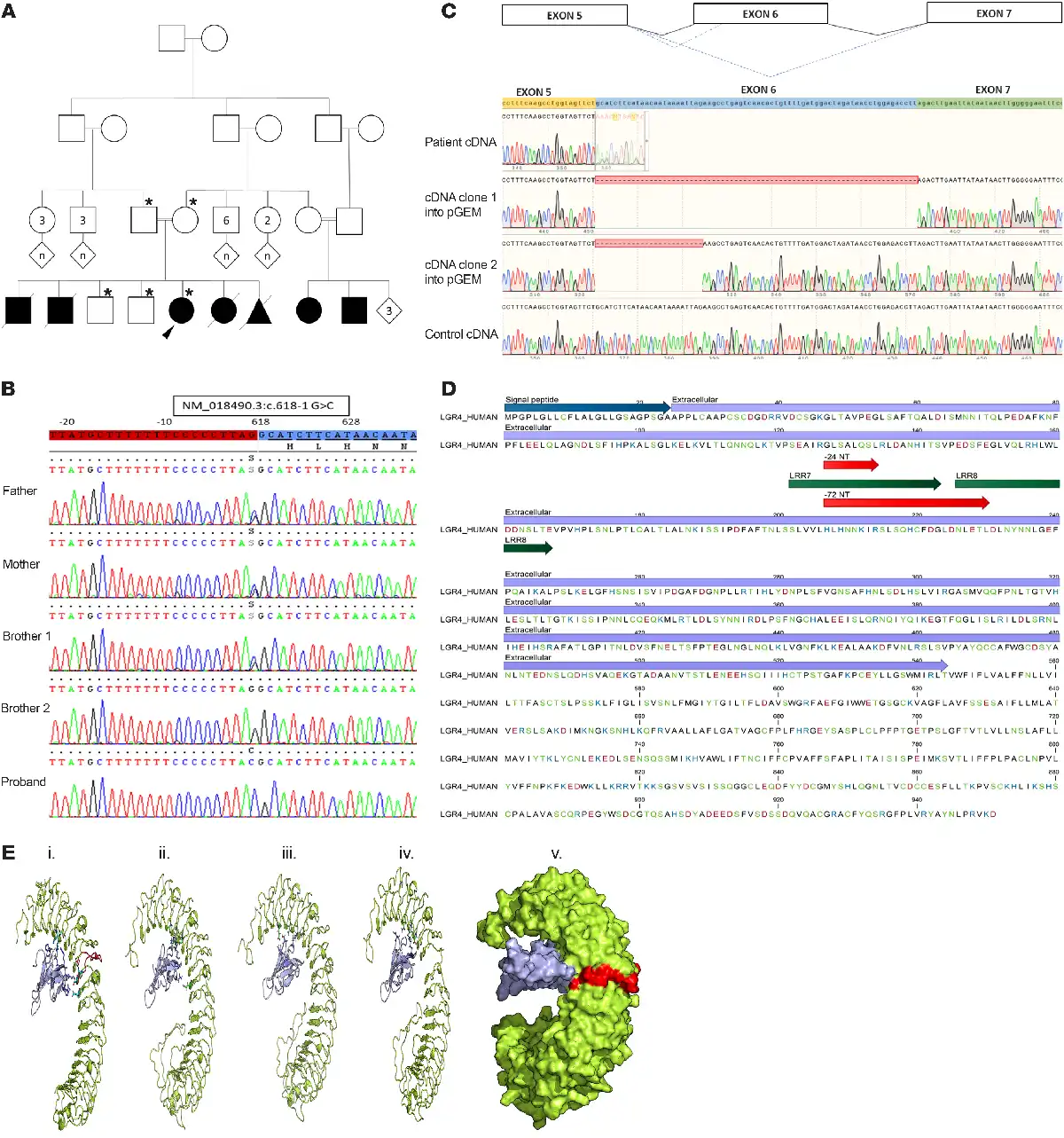 (A) Family pedigree showing first-degree consanguinity and multiple affected individuals. Squares: male; circles: female; diamonds: unknown sex; triangle: miscarriage. Black symbols represent affected and white symbols represent unaffected individuals. Numbers in symbols represent multiple individuals. The index patient is indicated by a black arrowhead. Asterisks indicate individuals for whom DNA was sequenced. (B) Partial chromatograms showing the LGR4 mutation NM_018490.5:c.618-1 G>C. Intron 5 (red) and exon 6 (blue) are highlighted. The proband is homozygous, parents and 1 brother are heterozygous, and 1 brother had the WT sequence. (C) LGR4 mRNA analysis of proband fibroblasts. The first track represents patient mRNA after reverse transcription, indicating presence of 2 transcripts. The 2 transcripts were separated by cloning and sequenced (2 middle tracks). The bottom track shows cDNA of control fibroblasts. The scheme above shows normal splicing in dark lines and the effect of the mutation on splicing in blue dotted lines. (D) Amino acid sequence of extracellular domain of human LGR4 that binds to RSPOs. Amino acids found deleted in the patient are located in LRR7 (–8 AA) and LRR7/8 (–24 AA) coded by exon 6 of LGR4. (E) Structure of LGR4 and its interaction with RSPOs. (i) Structure of human LGR4 extracellular domain in complex with part of RSPO1 (PDB 4KT1). Amino acids coded by exon 6 are depicted in red. (ii) Human LGR4-RSPO3 complex. RSPO3 shares high structural similarity with RSPO1 and binds to LRR7 and LRR8 of LGR4. (iii and iv) Patient LGR4, missing 8 or 24 amino acids. Several critical hydrogen-bonding residues in LGR4 are missing due to mutations, causing weaker interaction and binding of RSPO3 to mutant LGR4 proteins. (v) A surface view of the LGR4-RSPO3 complex, showing close interaction points. Exon 6–encoded residues are shown in red.