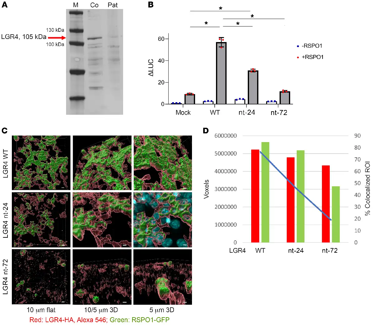 Western blot analysis showed that patient fibroblasts expressed LGR4 protein minimally compared with controls (Figure 2A), but the expression was also low in control fibroblasts from healthy individuals. Unfortunately, biomaterial from heterozygote family members was not available.