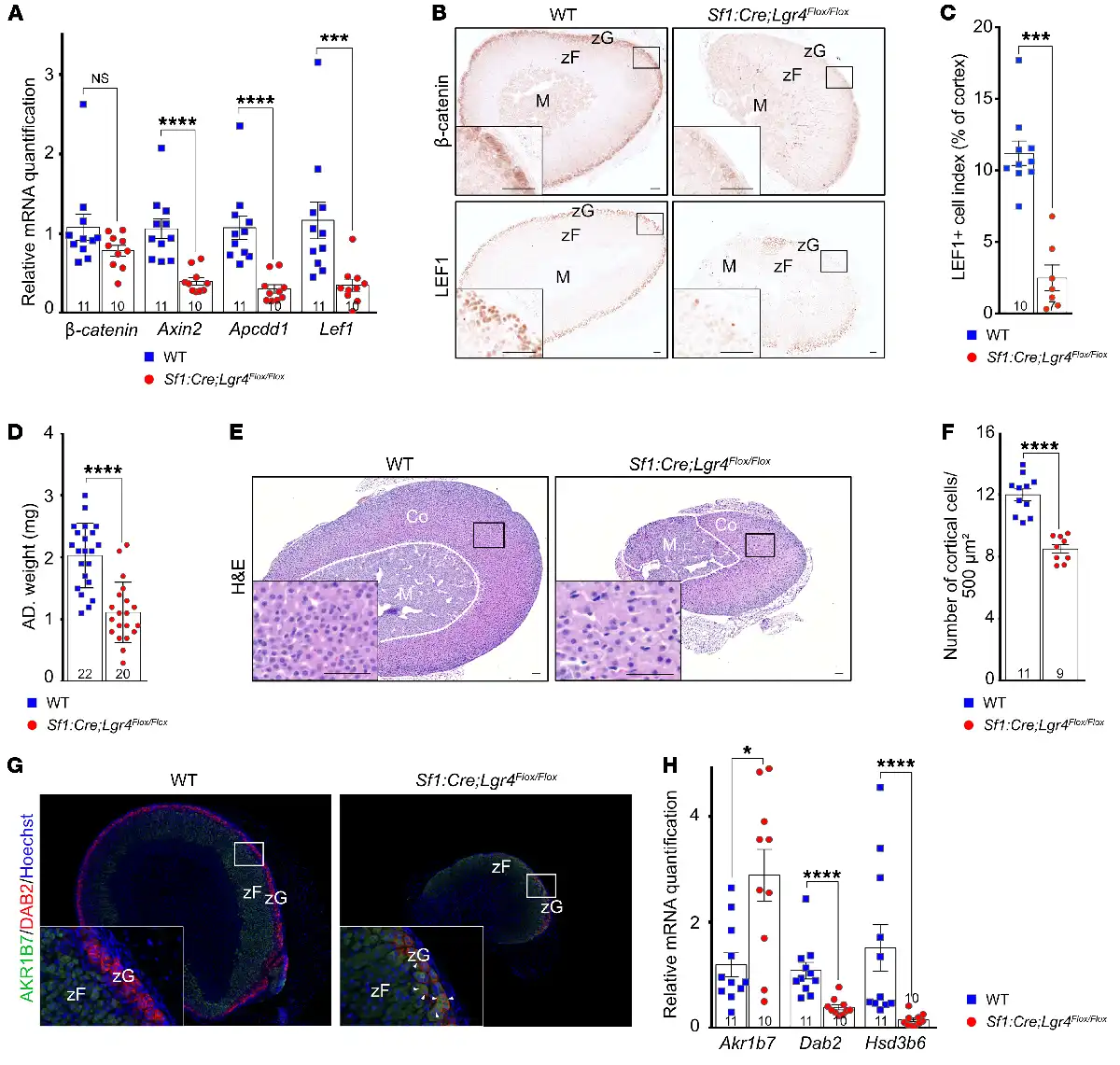 Figure 3. (A) RT-qPCR analysis of mRNA encoding Wnt/β-catenin signaling pathway–associated genes. (B) Immunohistochemical detection of β-catenin and Lef1. (C) LEF1+ cell index, defined as the percentage of LEF1+ cells over the total number of cortical cells. (D) Adrenal weight. (E) H&E staining of WT and Lgr4cKO adrenals. (F) Number of cortical cells per 500 μm2 of the cortex. (G) Coimmunostaining for Akr1b7 and Dab2 in WT and Lgr4cKO adrenals. (H) RT-qPCR analysis of mRNA encoding zone-specific markers (Akr1b7, Dab2, and Hsd3b6). All analyses were conducted in 5-week-old WT and Lgr4cKO female mice. zF, zona fasciculata; zG, zona glomerulosa; M, medulla; Co, cortex. Scale bars: 50 μm. Data are shown as the mean ± SEM. Numbers of individual samples analyzed are indicated within the bars. Statistical analyses in A, C, D, F, and H were conducted using Mann-Whitney tests in GraphPad Prism 9. *P < 0.05, ***P < 0.001, ****P < 0.0001.