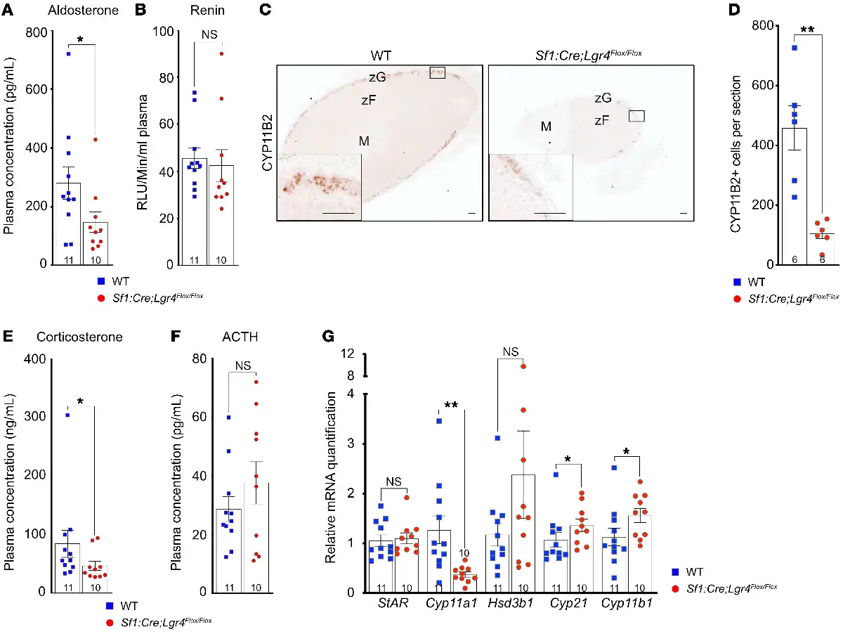 Figure 4. (A) Aldosterone plasma concentration and (B) renin activity in 5-week-old WT and Lgr4cKO female mice. (C) Immunohistochemical detection of CYP11B2. Scale bar: 50 μm. zF, zona fasciculata; zG, zona glomerulosa; M, medulla. (D) Number of CYP11B2+ cells per adrenal section. (E) Corticosterone and (F) plasma ACTH concentration. (G) RT-qPCR analysis of mRNA encoding steroidogenesis-related genes. All analyses were conducted in 5 weeks WT and Lgr4cKO female mice. Data are shown as the mean ± SEM. Numbers of individual samples analyzed are indicated within the bars. Statistical analyses in A, B, and D–G were conducted using Mann-Whitney tests in GraphPad Prism 9. *P < 0.05, **P < 0.01.