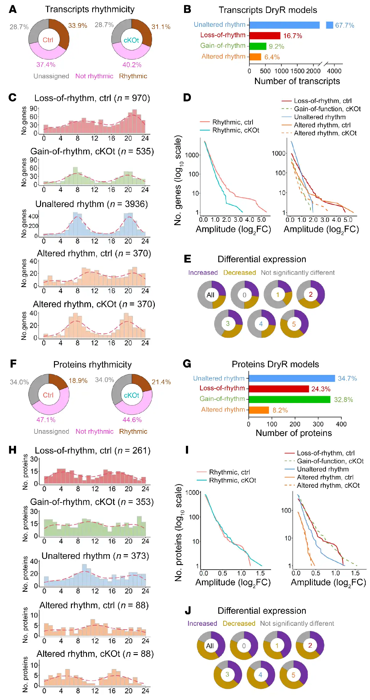 (A) Donut charts showing the percentage of rhythmic, nonrhythmic and unassigned renal transcripts in control (Ctrl) and cKOt mice. (B) Histogram showing the number and percentage of renal rhythmic transcripts assigned to dryR rhythmicity models. (C) Histogram showing the acrophase distribution of renal transcripts assigned to dryR rhythmicity models 2, 3, 4, and 5. Red dashed lines: kernel density estimates. (D) Cumulative number of renal transcripts assigned in the indicated rhythmicity pattern in function of amplitude. (E) Donut charts showing the proportion of renal transcripts displaying a differential mean expression according to limma R package () in Ctrl versus cKOt mice for each dryR rhythmicity model. (F) Donut charts showing the percentage of rhythmic, not rhythmic, and unassigned renal proteins in Ctrl and cKOt mice. (G) Histogram showing the number and percentage of renal rhythmic proteins assigned to dryR rhythmicity models. (H) Histogram showing the acrophase distribution of renal proteins assigned to dryR rhythmicity models 2, 3, 4, and 5. Red dashed lines: kernel density estimates. (I) Cumulative number of renal proteins assigned in the indicated rhythmicity pattern in function of amplitude. (J) Donut charts showing the proportion of renal proteins displaying a differential mean expression according to limma R package in control (Ctrl) versus cKOt mice for each dryR rhythmicity model.