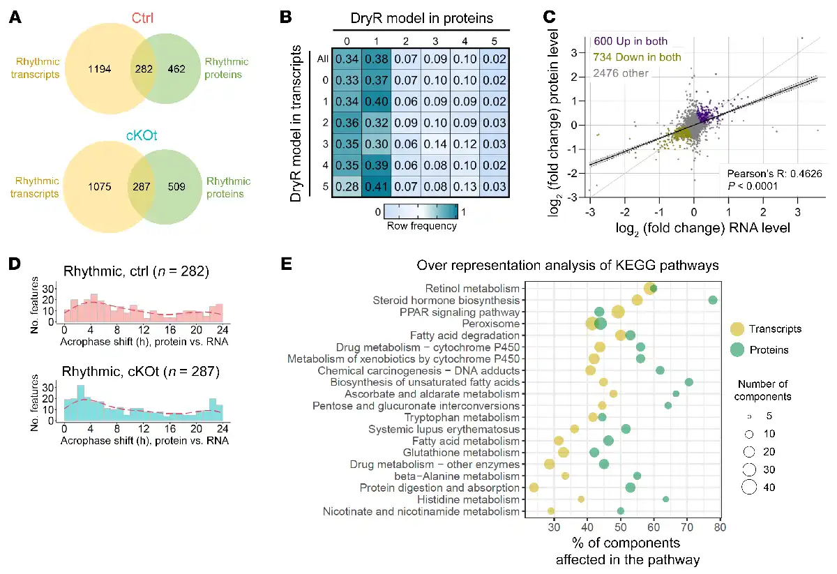 (A) Venn diagram showing the number of rhythmic transcripts and proteins among all detected pairs in control (Ctrl) and cKOt mice. (B) Table showing the frequency of transcripts and proteins pairs falling in the same dryR rhythmicity model. (C) Scatter plot and regression line with 95% confidence intervals of log2 fold changes in mean expression between Ctrl and cKOt mice at transcriptional (x axis) and protein (y axis) levels. (D) Histogram showing the distribution of the acrophase shift between transcripts and proteins in Ctrl (upper panel) or cKOt (lower panel) mice. Red dashed lines: kernel density estimates. (E) Scatter plot of all KEGG metabolic pathways significantly altered (Padj < 0.25) in both transcriptomic and proteomic renal data sets. Results are based on over representation analyses (ORA) of transcripts or proteins showing a significantly altered mean expression (Padj < 0.05 obtained with limma R package) with an absolute fold change > 1.2. The size of each dot depends on the number of transcripts or proteins, or components, of the pathway significantly affected in cKOt mice. Pathways are sorted from the lower to the higher value obtained by multiplication of Padj of both data sets.